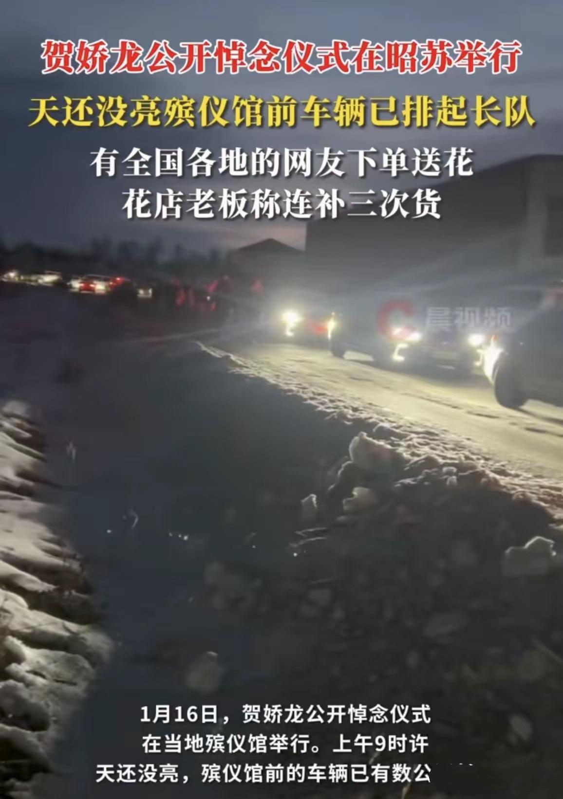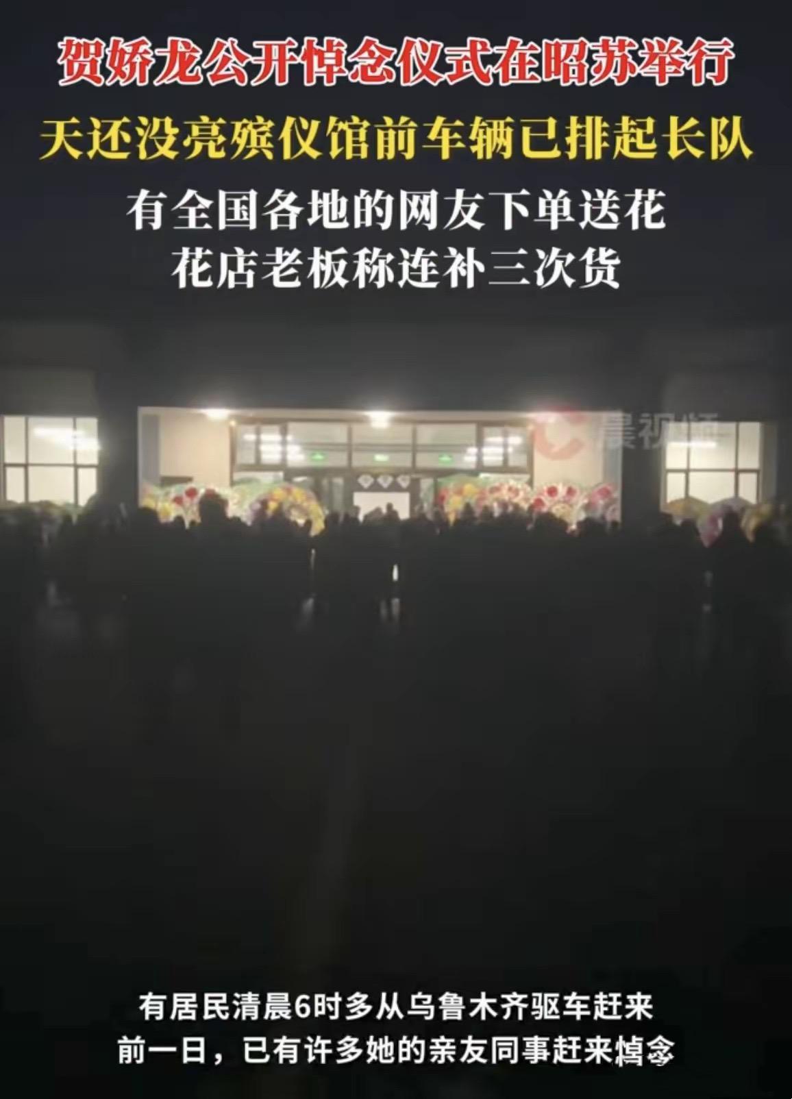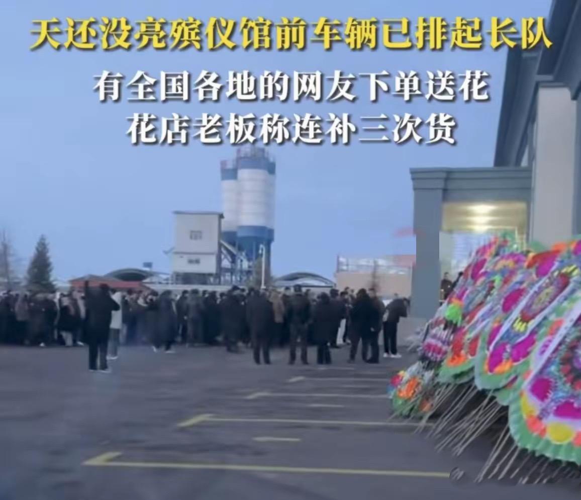 天還沒亮的時候,殯儀館前的車輛就開始排起長龍。即便是沒有趕到的網友,也通過網絡下單的方式,給賀嬌龍送上鮮花。