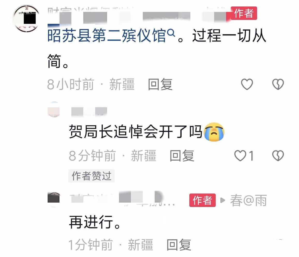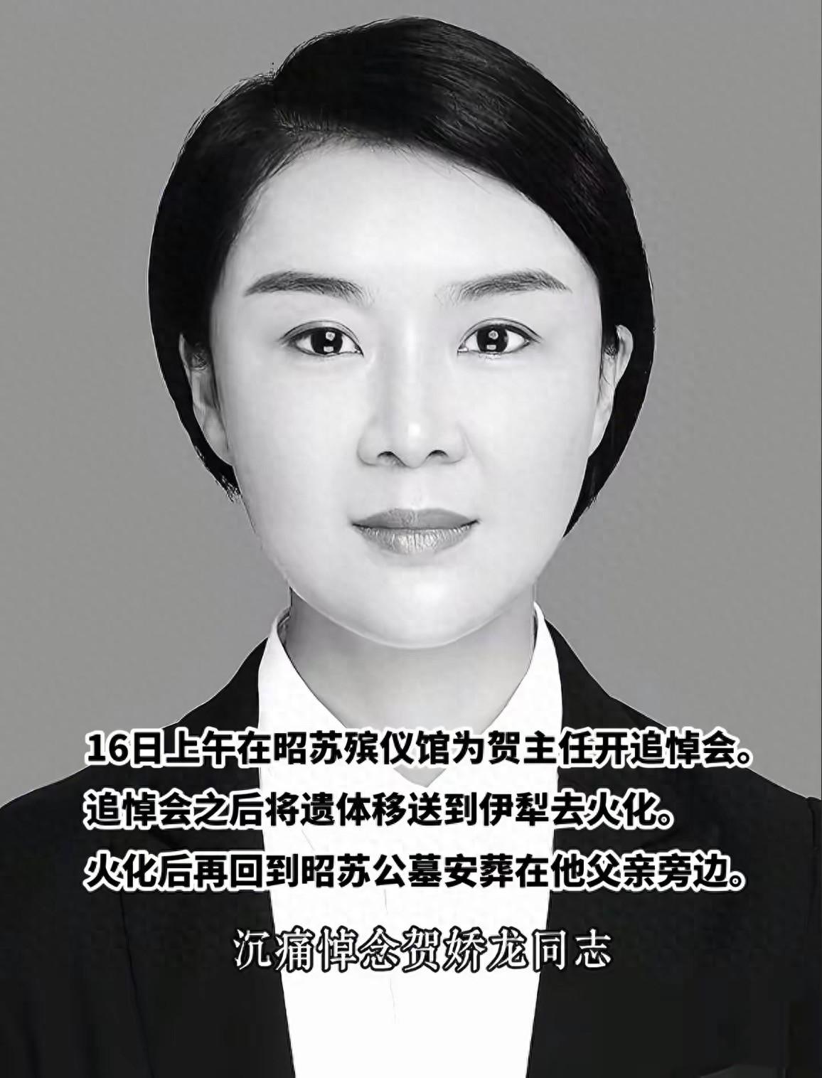 16日上午賀嬌龍的公開悼念儀式在昭蘇舉行,在追悼會之後遺體將會移去伊犁火化,火化後再回到昭蘇公墓安葬在父親身旁。