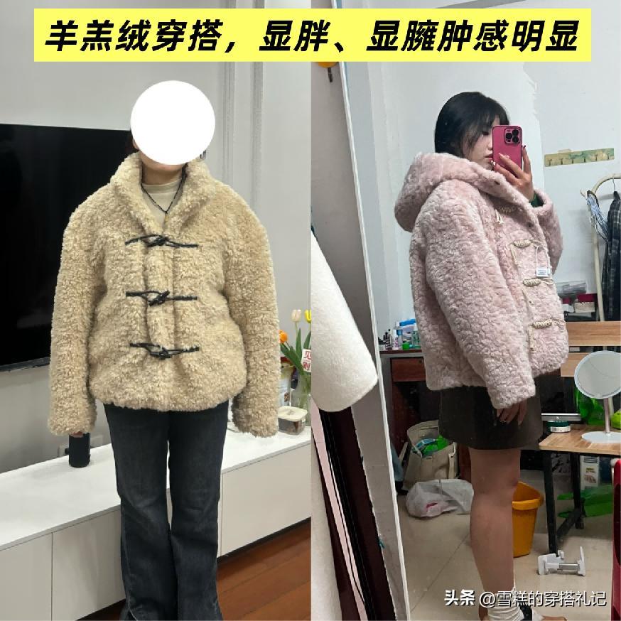 第二款不推薦的系列搭配就是踩雷的羊羔絨了,首先這款單品本身的劣勢就屬於容易彰顯的非常有膨脹感,不管是搭配裙子還是褲子都很難有顯瘦和穩定的線條彰顯出來,如果不是非常顯瘦的身材狀態,這樣的單品搭配組合儘量是不要選擇運用了,保暖效果也不如羽絨服和帶絨的大衣系列。