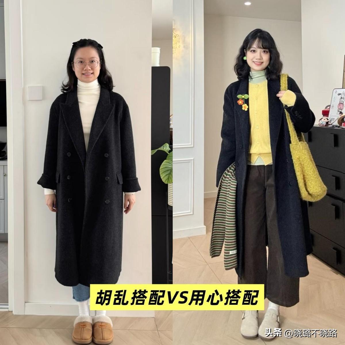 冬日穿搭,最重要的就是層次感和比例,就拿黑色大衣來說,內搭過分單調,模糊了腰線位置,自然會有土味感,再貴的衣服也會顯廉價。