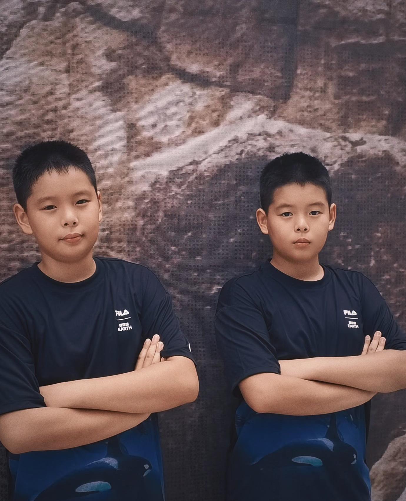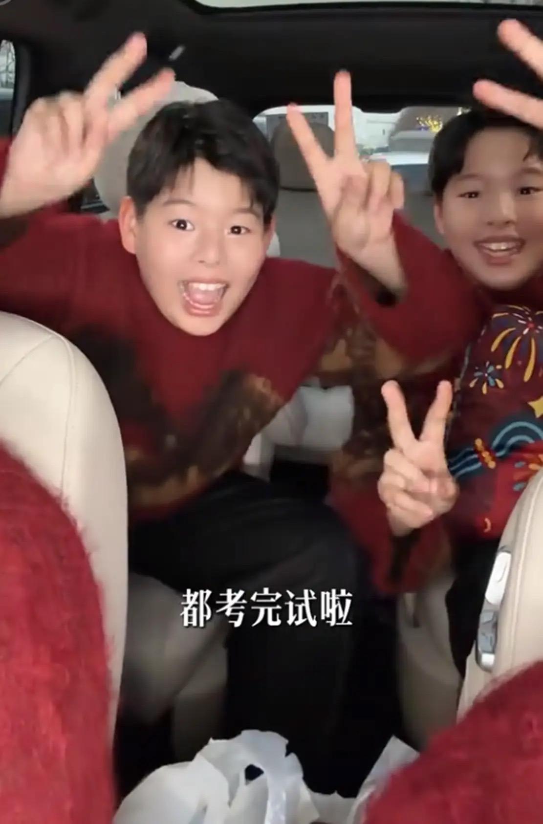 兩個兒子也出鏡了,12歲的雙胞胎兒子大方露臉。沒有任何遮擋鏡頭,兄弟倆都是濃眉大眼的、簡直長得一模一樣。