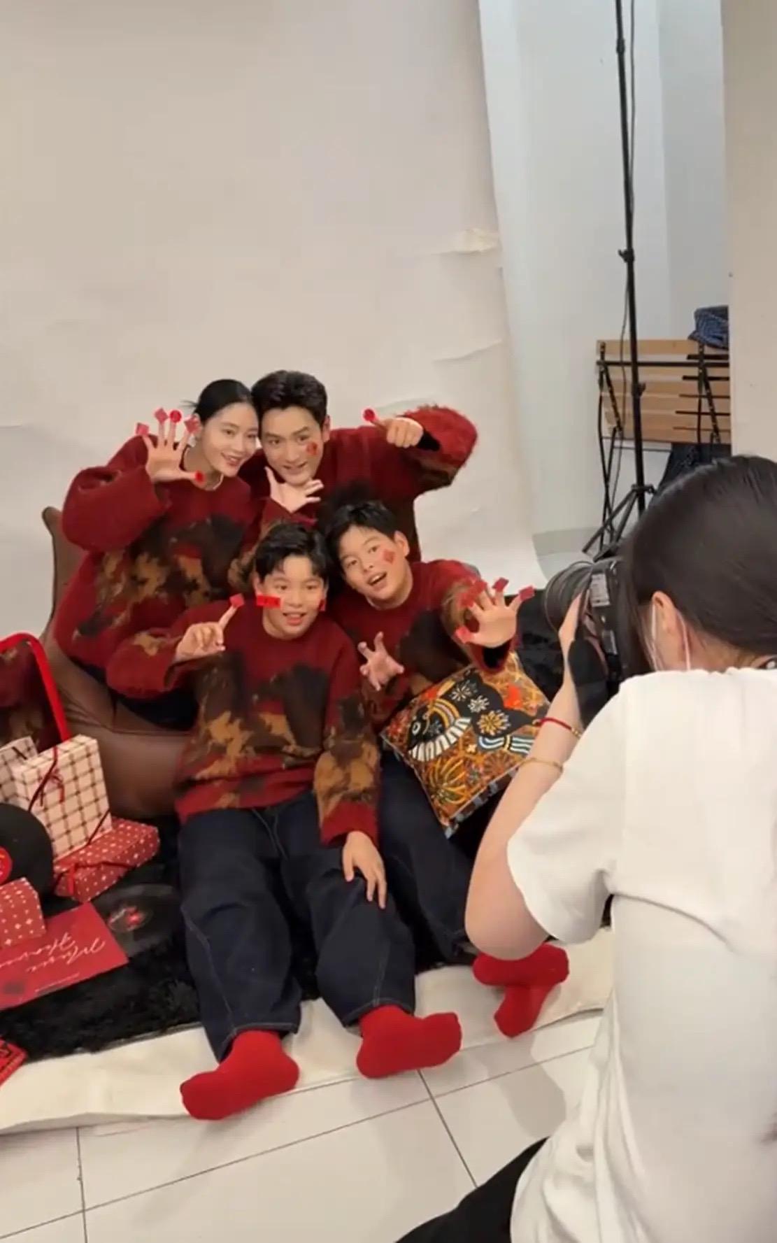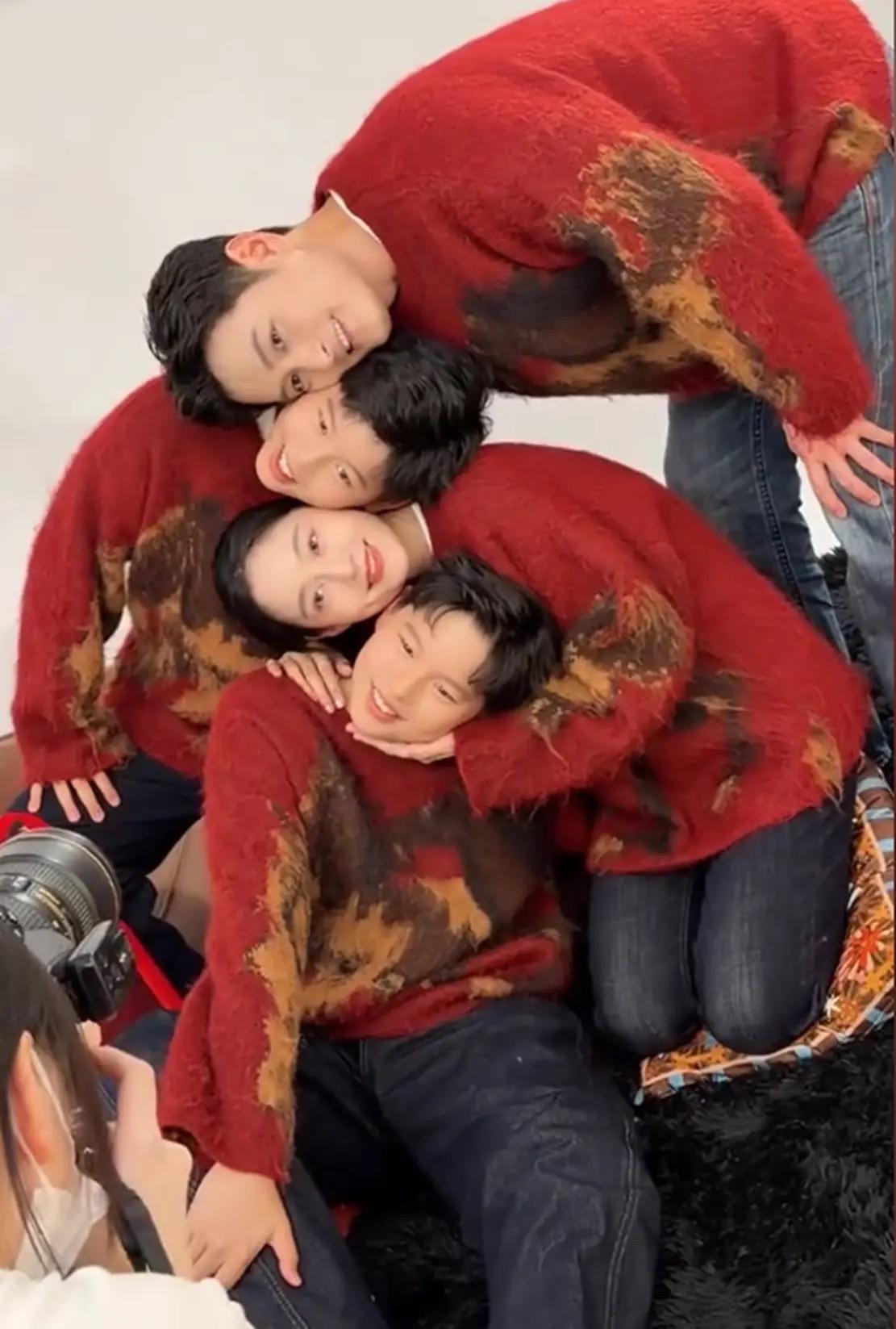 他們在一個影棚,請攝影師拍照。一家人頭疊頭的畫面也很溫馨,小兒子在最下面,媽媽王媛可託着他的頭,爸爸在最上面,輕輕挨着大兒子的臉。