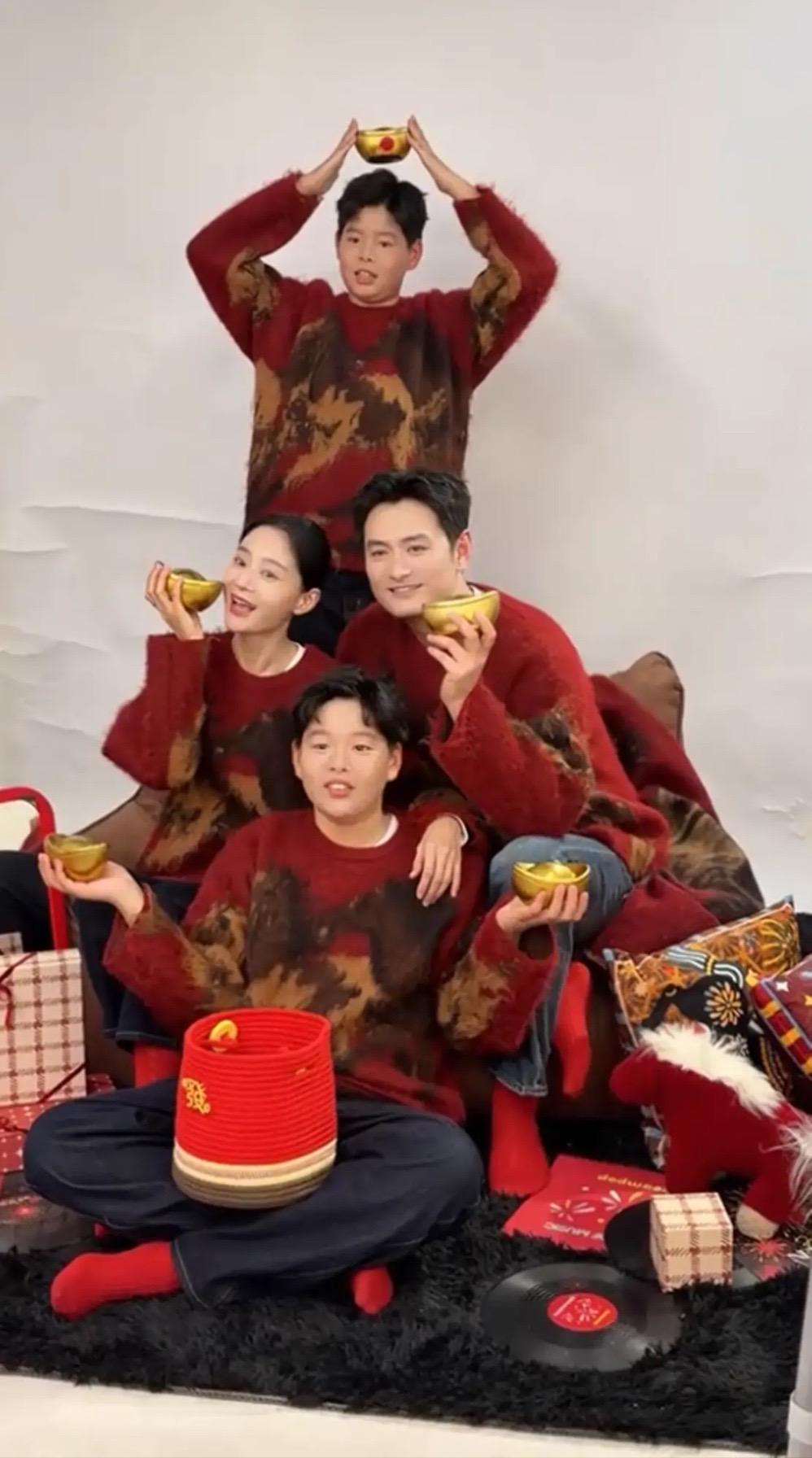 一家人手捧金元寶拍照片,這也太喜慶了,新年的氛圍感不就來了嗎?王媛可的倆兒子都像爸爸,王雨基因太好了。