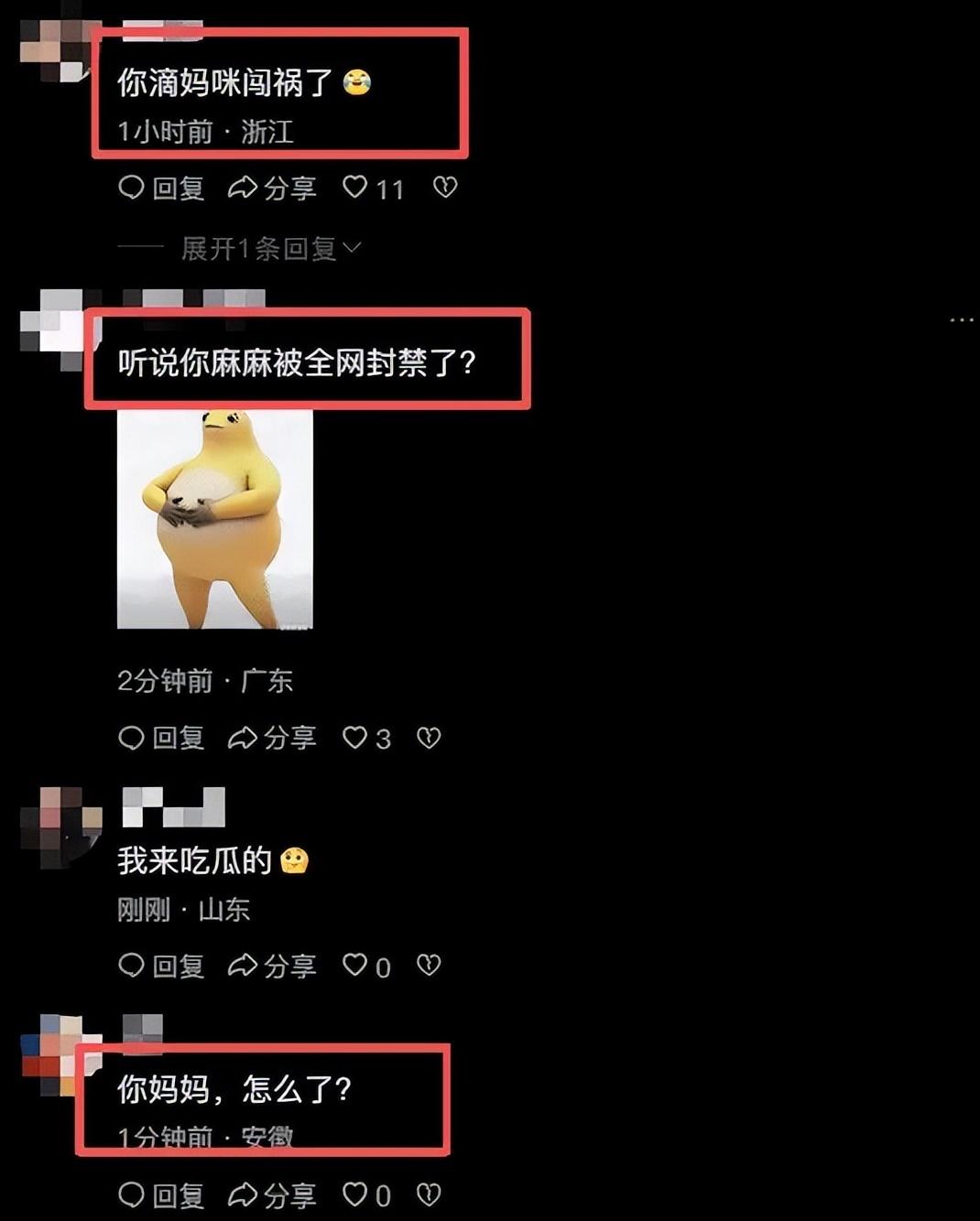 有人說你的媽咪闖禍了,有人說你的媽媽被全網封禁了,還有人就是單純來喫瓜的。