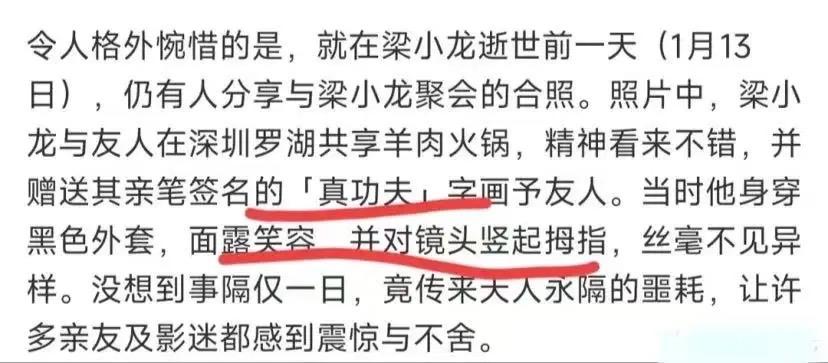 梁小龍走了,非常意外。甚至連家人都不敢接受,畢竟就在前一天還在喫火鍋,前幾天還被偶遇和朋友一起喫燒鵝。