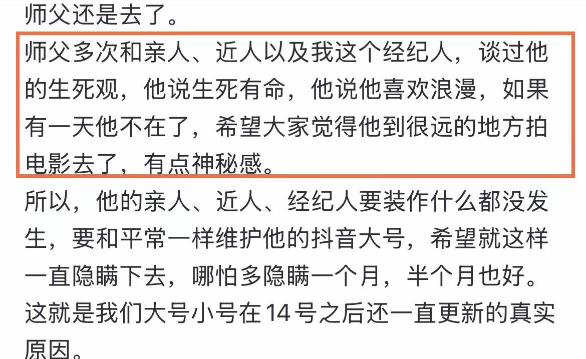 親人、經紀人、運營社媒賬號的團隊,都裝作什麼事情都沒發生,還是照常更新維護賬號。想要隱瞞下去,不管是一個月、還是半個月。