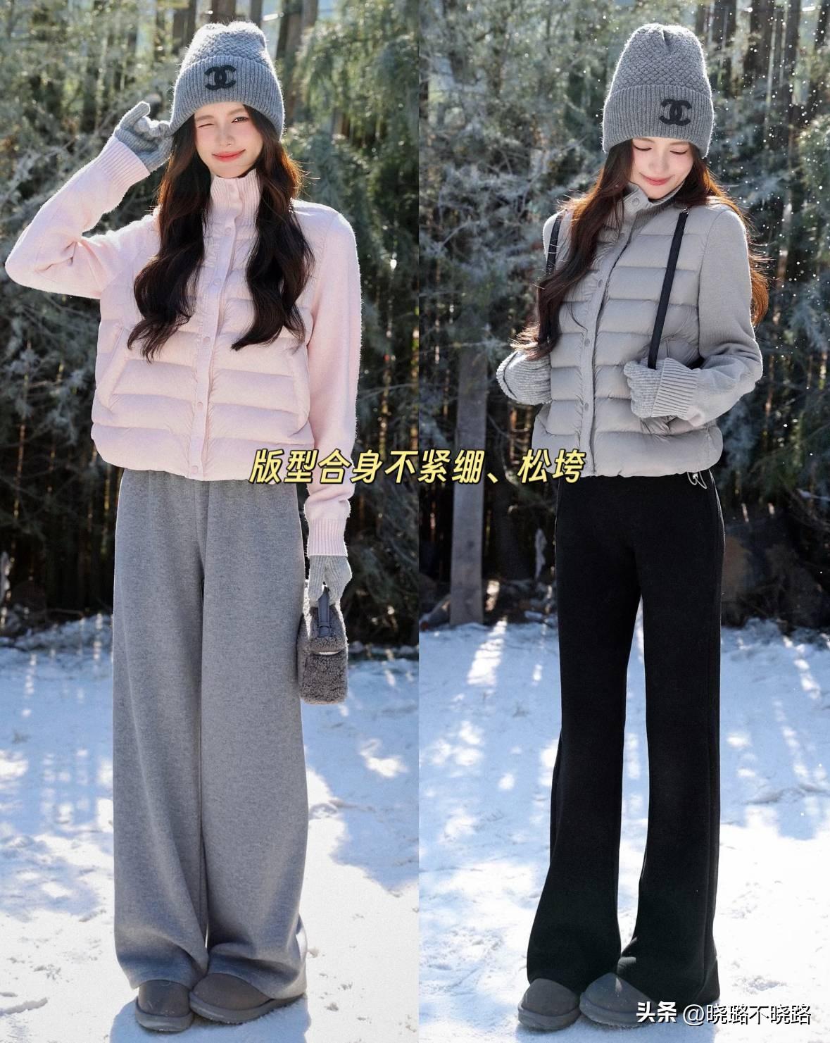 除此之外,下裝的挑選也至關重要,針對腿型勻稱的姐妹來說,像這種貼合度高的無痕褲,就能夠和蓬鬆的冬裝相輔相成,若腿型不直、腿粗,更推薦穿垂感好的直筒褲、喇叭褲。