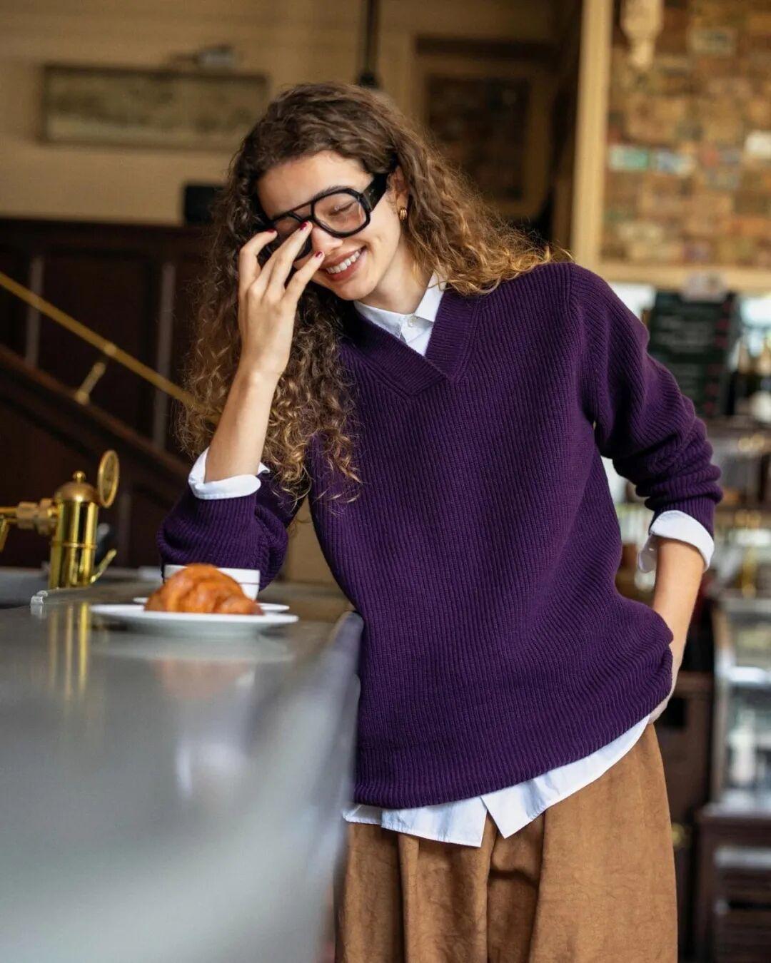 毛衣+襯衫則是用筋骨感撐起軟糯,只露出一塊襯衫領子也很有用。▼