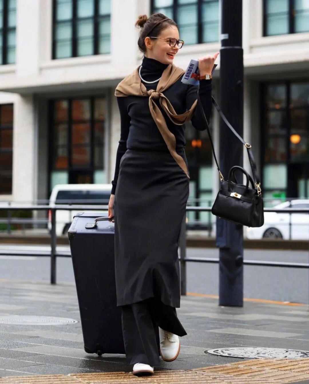 他們還很愛用裙+襪(褲襪)+鞋的順色搭配,讓下身連成一體,視覺上更拉長腿部線條。▼