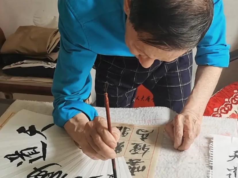 閒來無事,就在自家的茶几上寫毛筆字,給扇子題字。不知道他家裏是不是沒有高一點的寫字檯,這樣寫字對老人家來說太費腰了。