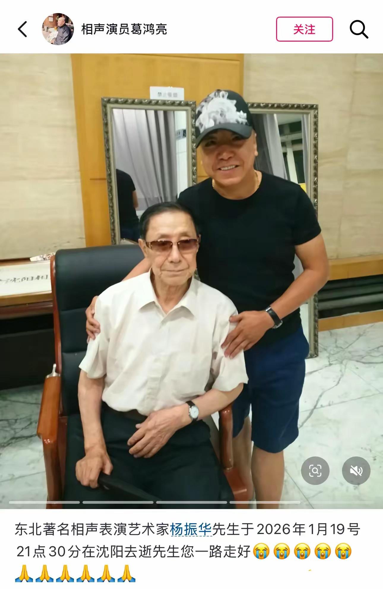 東北著名相聲表演藝術家楊振華先生於2026年1月19日21點30分在瀋陽去世。聽到這個噩耗,久久不能釋懷。