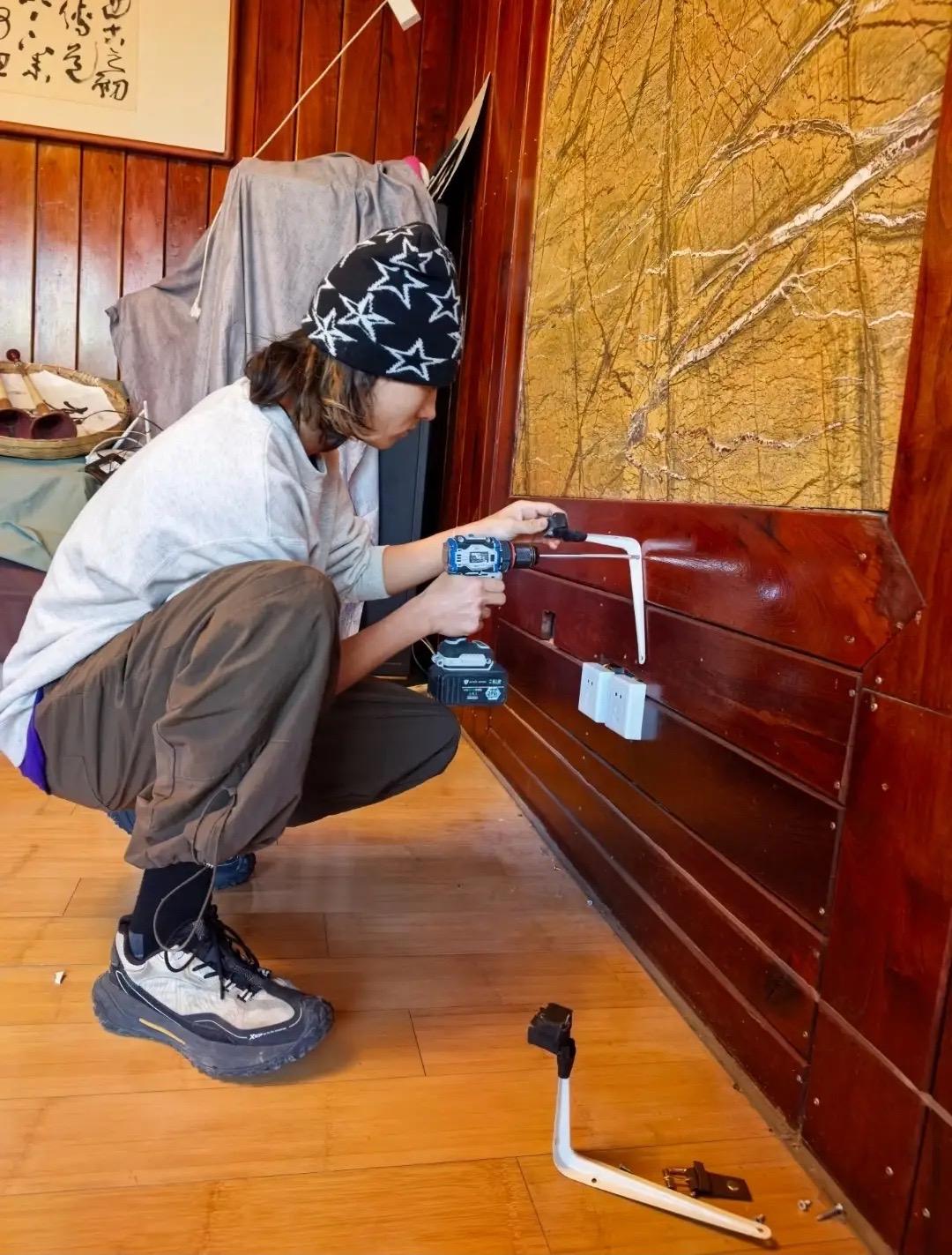 雅酷穿着淺灰色衛衣、束腳的工裝褲,登山鞋,拿着電動螺絲刀在牆面上打孔,他才18歲、已經可以獨立安裝電視機了,超厲害。