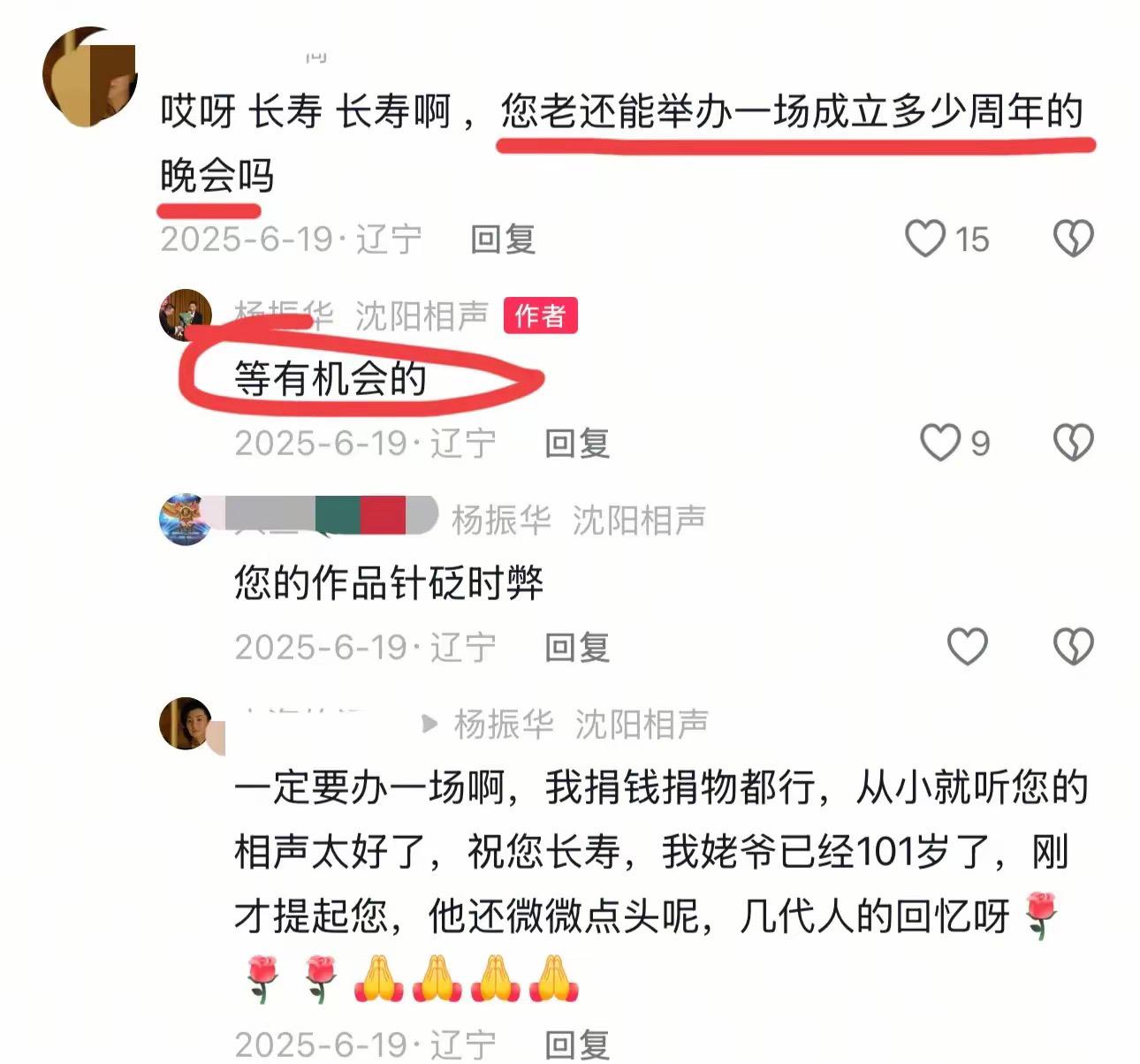 就在這個動態下方,有粉絲留言、希望老先生還能辦一場週年晚會。楊振華答應了,表示“等有機會的”。