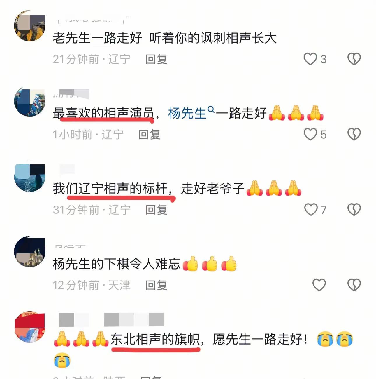 有人是聽他的諷刺相聲長大的,也有人讚揚他是遼寧相聲標杆。還有人說,楊先生的下棋讓人難忘。你一言我一語,彷彿又回到了那個相聲時代。