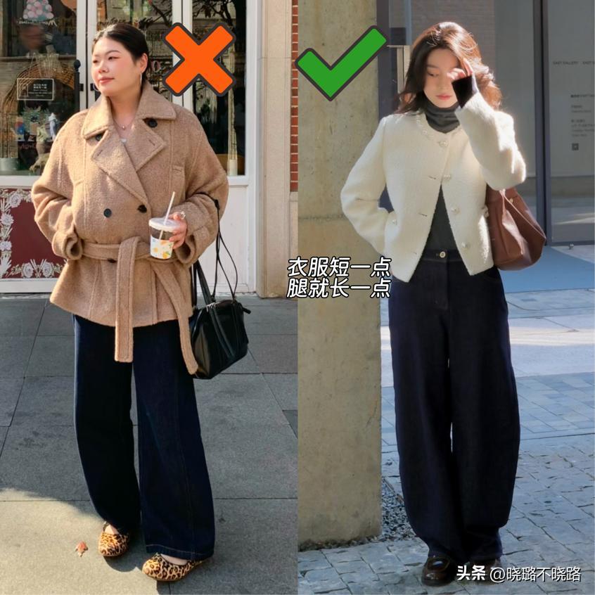 穿搭的核心是優化身材比例,而腰線正是決定比例的“生命線”。傳統長款大衣的寬鬆廓形,很容易模糊腰線位置,讓小個子或五五分身材的人顯得拖沓矮壯。“上短下長”的穿搭則直接用短款上衣截斷腰線,再搭配高腰下裝,將視覺重心上移,哪怕是天生五五分身材,也能輕鬆穿出三七分的黃金比例。這種“人爲造腰線”的技巧,比任何顯高單品都更直接有效,堪稱身材比例的“作弊神器”。
