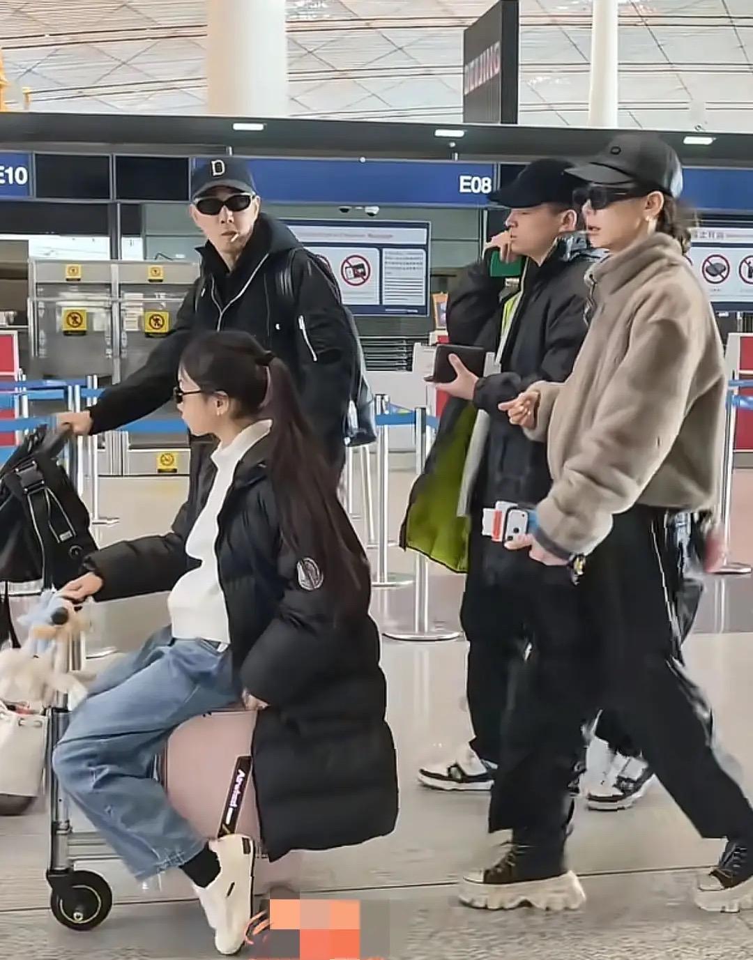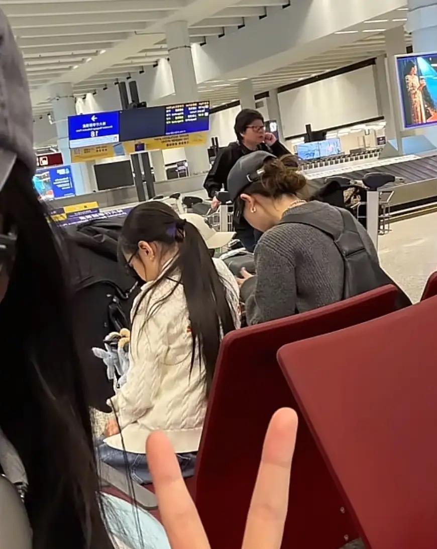 Lucky和戚薇坐下來候機的時候,看到她髮根的位置染了紫色頭髮。小姑娘也開始愛美了,不過這一撮紫發不顯眼,如果不仔細看都發現不了。