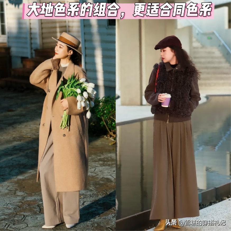 大地色系的搭配,最經典的當然就是同色調的運用了,也建議屏幕前的各位女性可以用這樣的穿搭,將更加和諧穩定的線條走向進行優化,寬鬆型的設計或者是直筒型的單品,而言是很具有優勢的。