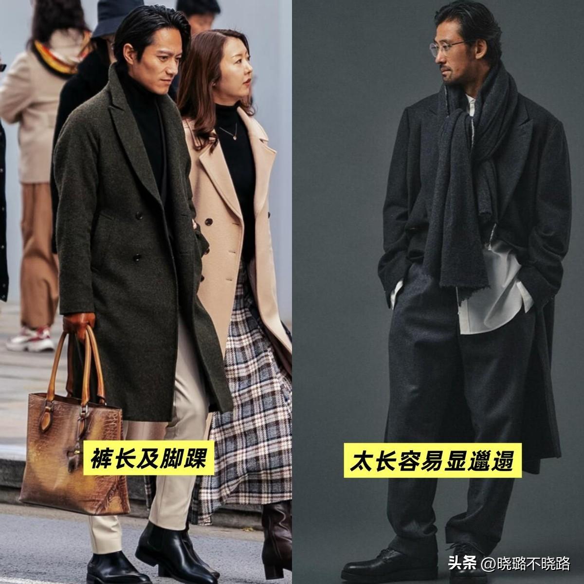 身穿大衣,搭配的褲子也很重要,特別是闊腿的長度,如果太過拖沓,就很容易堆積在鞋面上,顯得邋遢又老土,最嚴重的是壓身高。