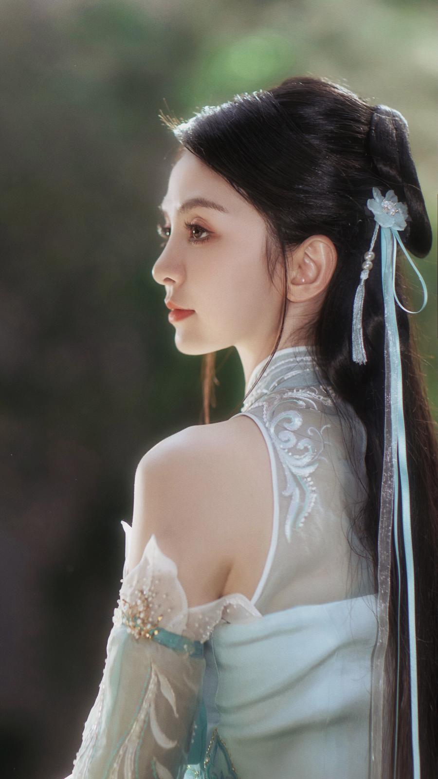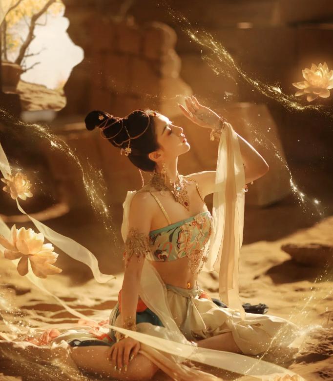 演繹敦煌與唐代風格作品時,她的服飾盡顯華夏美學的精髓:《大夢敦煌》中飾演月牙,身着一襲水綠襦裙,裙襬繡着細碎沙紋,袖口綴以薄紗,旋轉時如大漠流沙、清泉奔湧,既貼合敦煌壁畫的飄逸感,又凸顯角色捨命爲愛的俠義柔情,獲封“鐵流的月牙”。