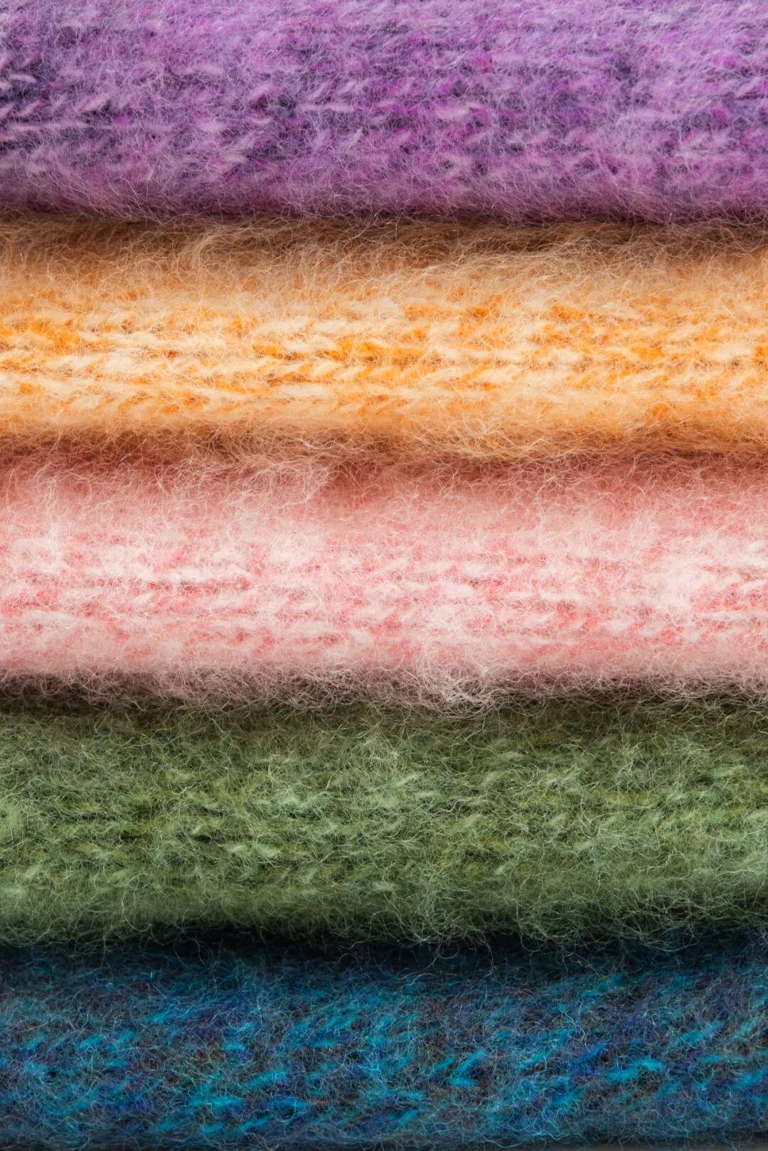 要先把羊絨做成小粒子,染色後反覆融入紗線,才能做出這麼均勻又靈動的彩點效果!▼