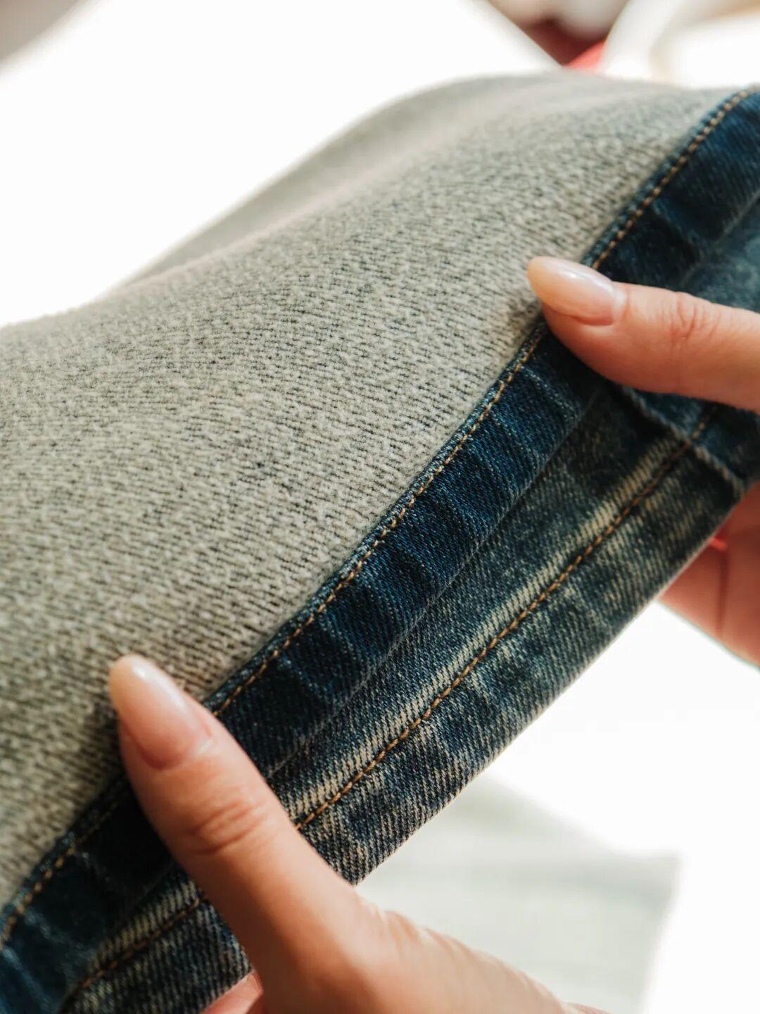 面料在原牛仔面料做了抓毛工藝,內裏是軟軟糯糯的磨毛,比一般的牛仔褲更保暖,早春穿非常合適。▼