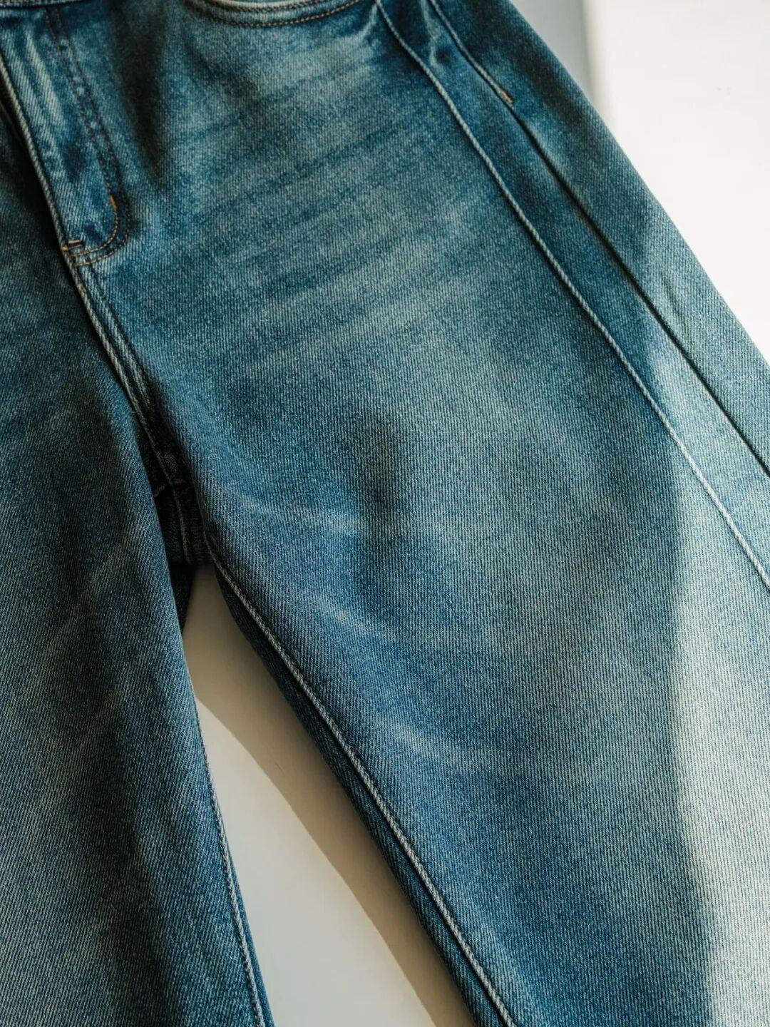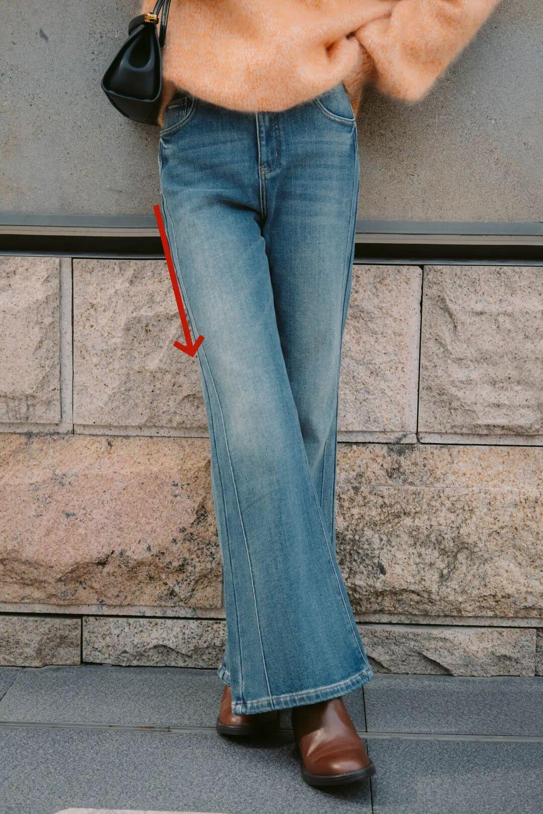這條牛仔褲並非普通微喇,而是經過 立體剪裁的“直筒微喇”褲。