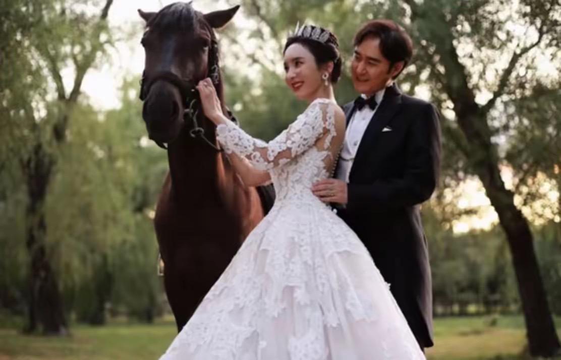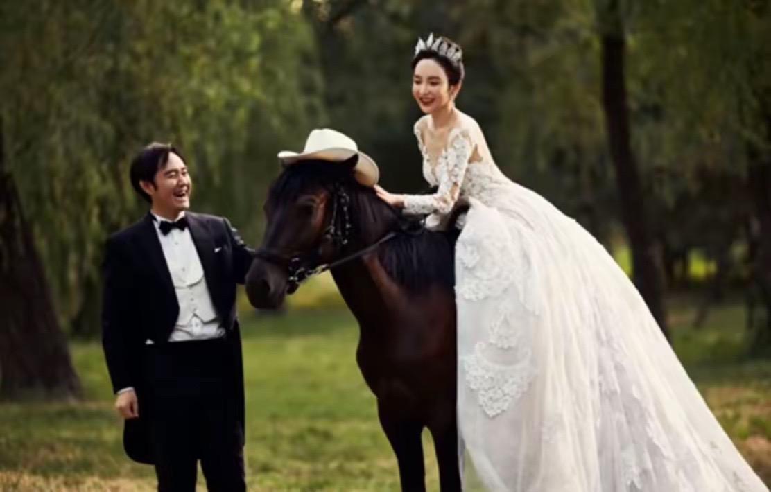 何昊陽穿着白色蕾絲婚紗,頭上戴着皇冠,側身騎馬的模樣好美。馮雷對着老婆開懷大笑,幸福從此刻定格。