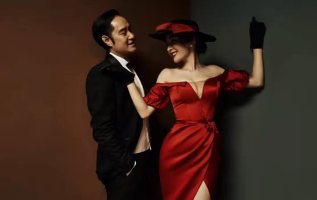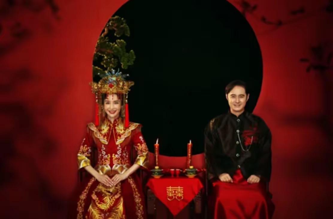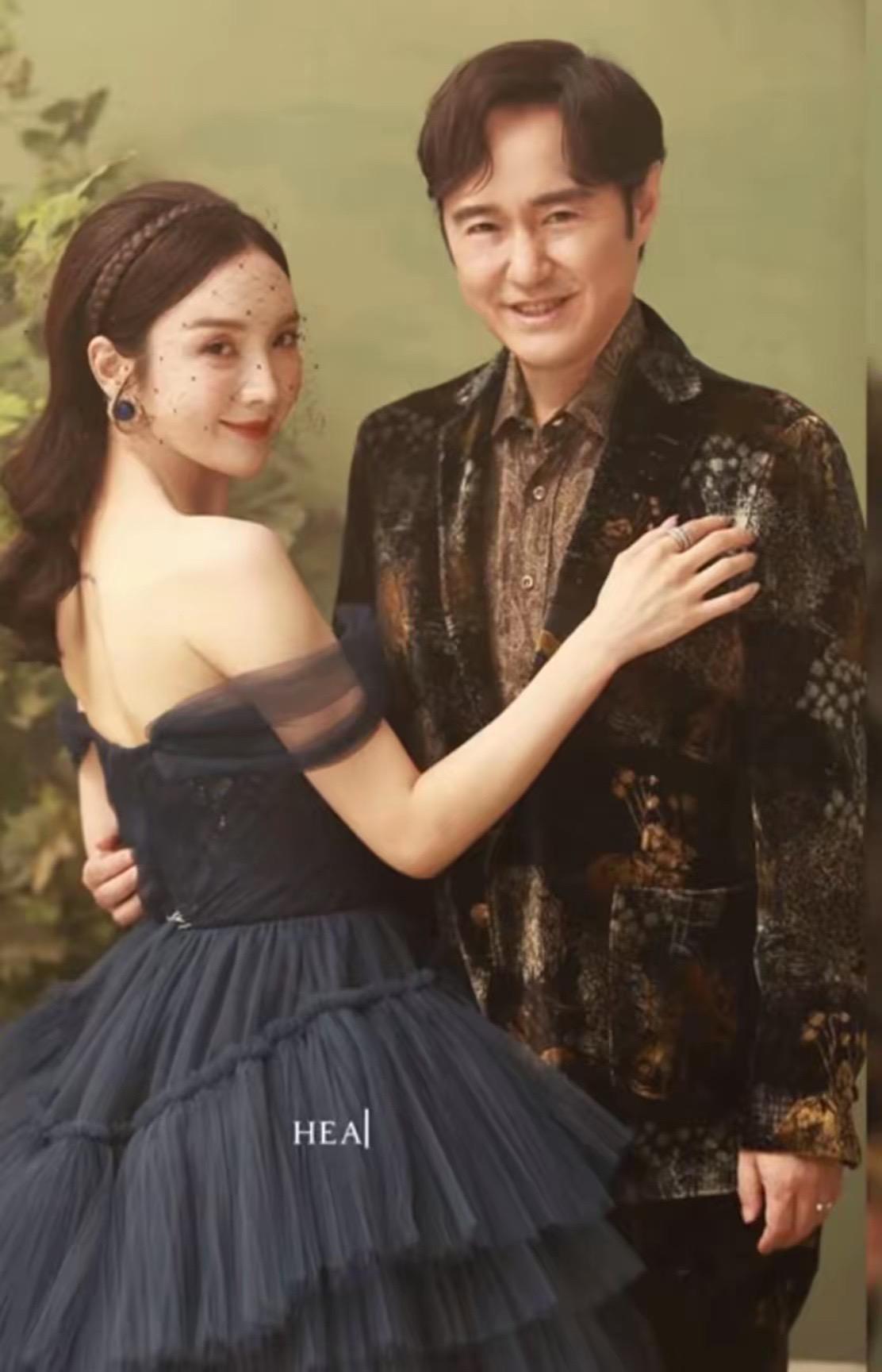 兩個人拍了多種風格的結婚照,雖然有9歲的年齡差,但看起來還是挺般配。馮雷本來就是長相成熟的男人,所以五十多歲了也不顯老,感覺還和年輕時候一樣。