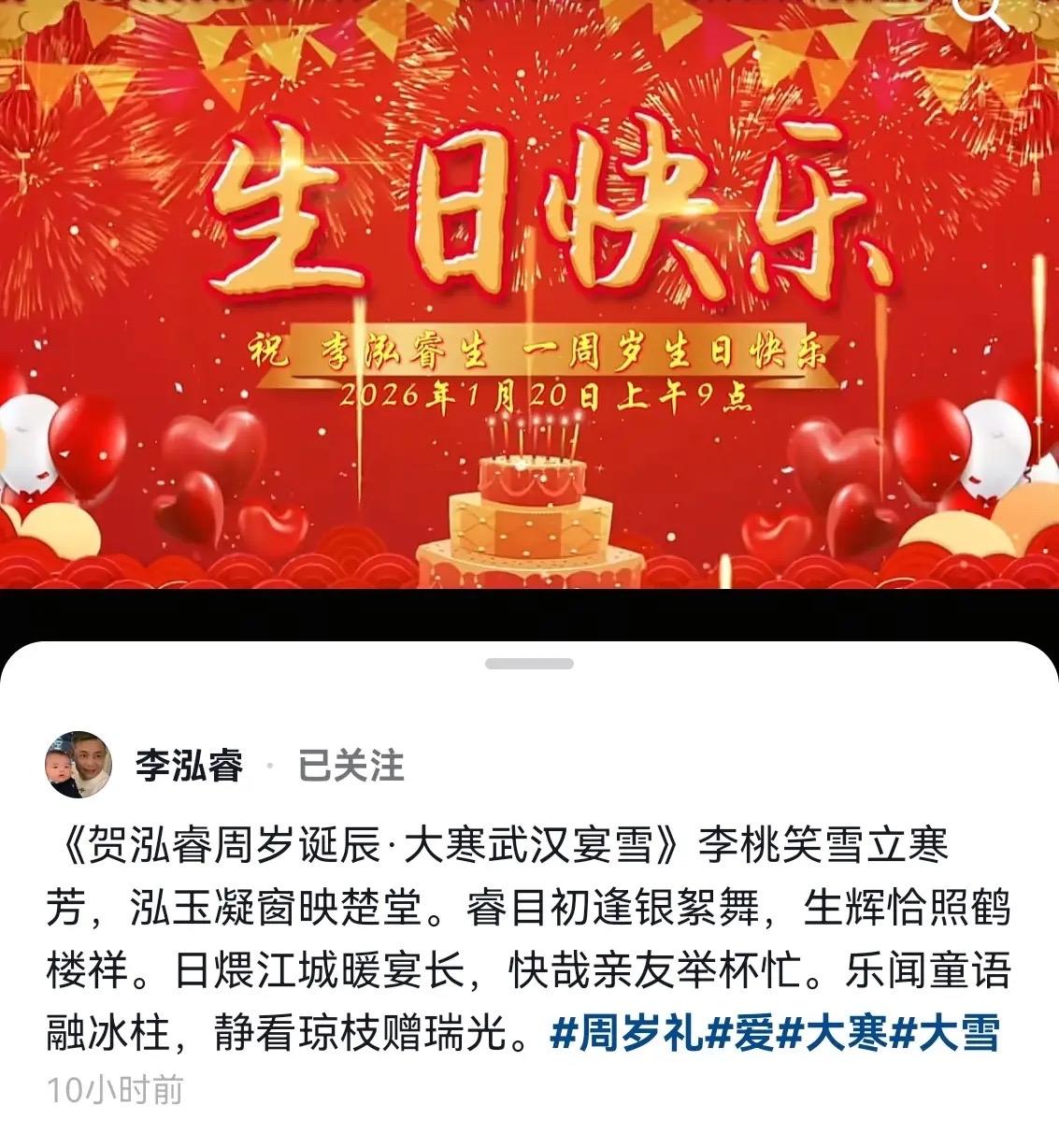 2025年1月,他們的兒子李泓睿在加拿大出生,現下已經滿一週歲了。夫妻二人給兒子辦了小型生日宴,場面非常熱鬧。