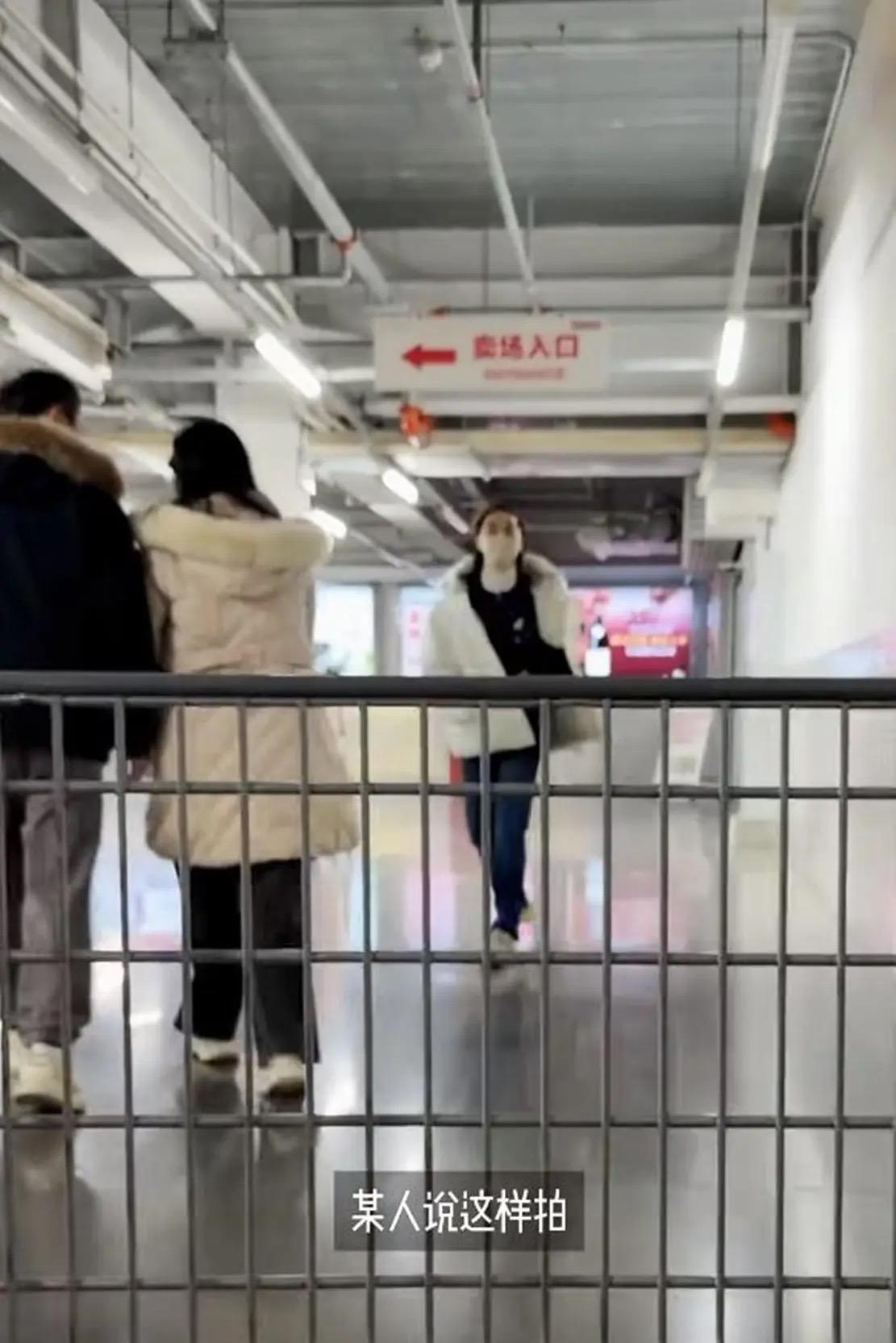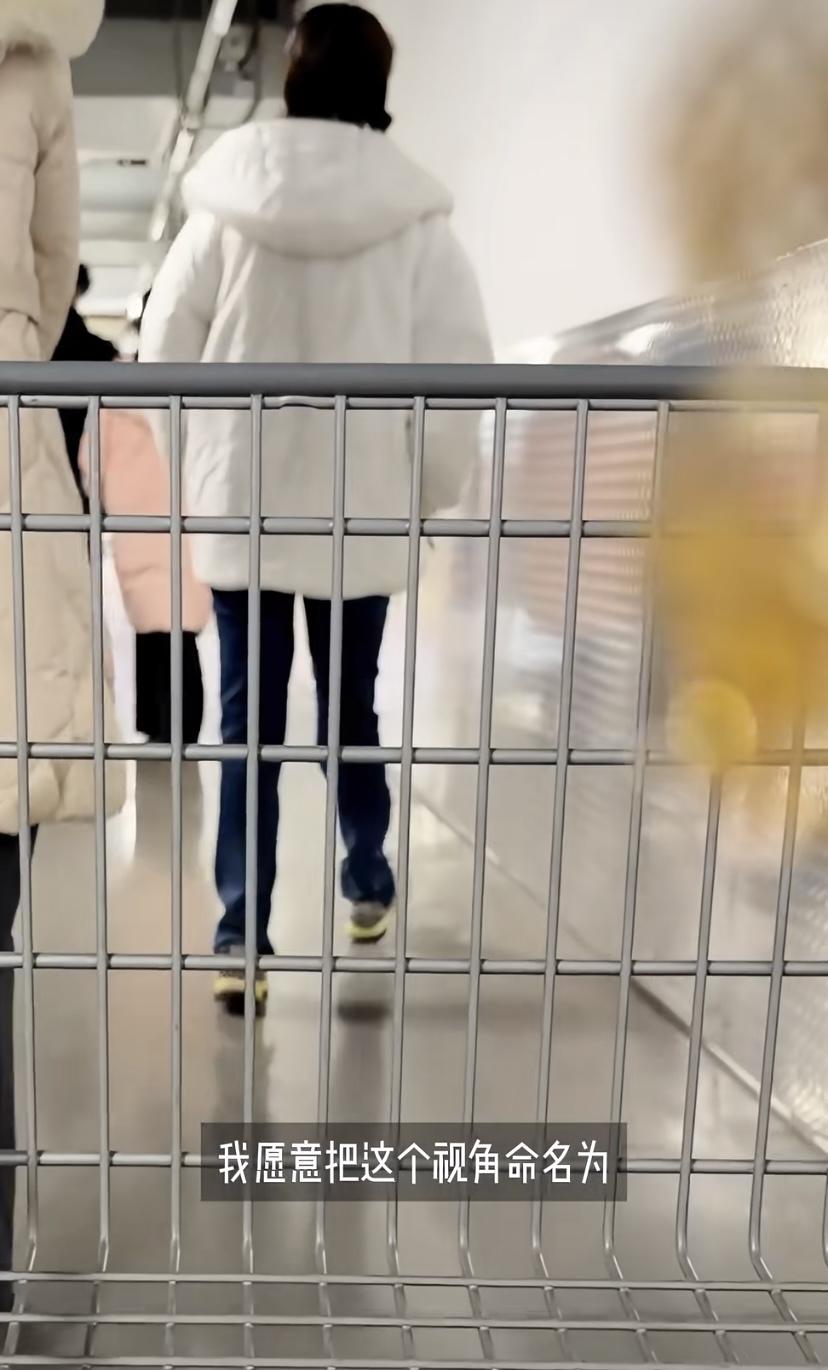 老公在後面推着購物車,王冠走在前面雙手插兜,白色羽絨服、深藍色牛仔褲、雙手插兜,這個背影確實挺文藝的,很有意境。
