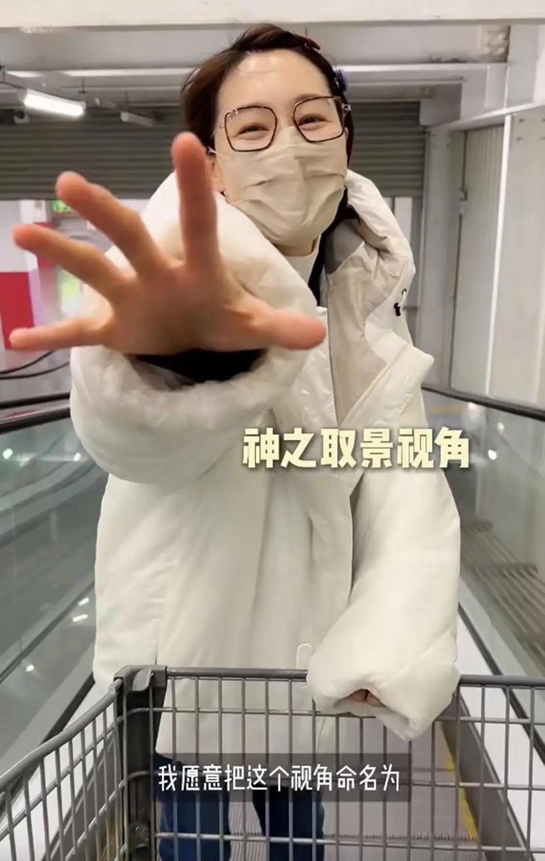 她穿了一件白色羽絨服,在老公前面蹦蹦跳跳的,老公就在身後給她拍照。她說老公的視角下,自己很像文藝女神。
