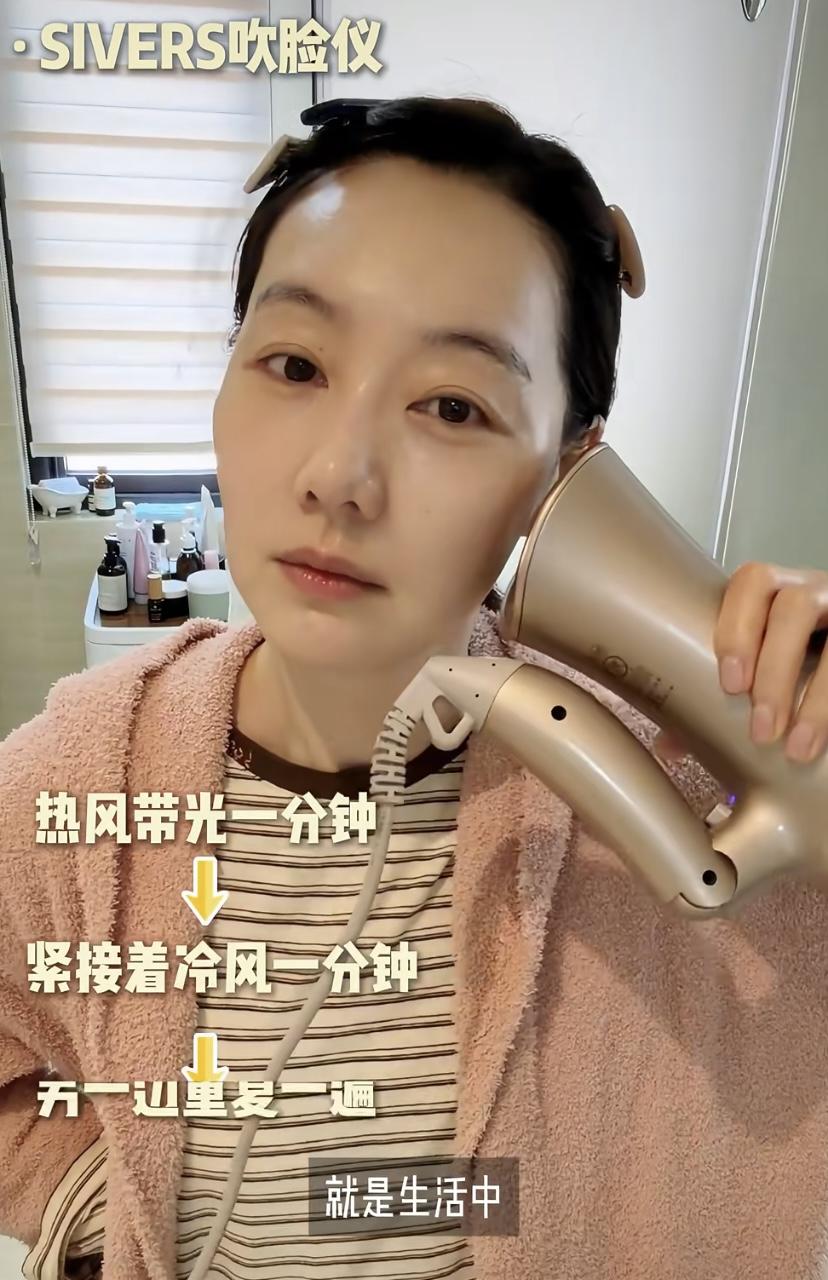 精華油麪霜都依次塗抹之後,王冠還用吹臉儀來促進皮膚的吸收。