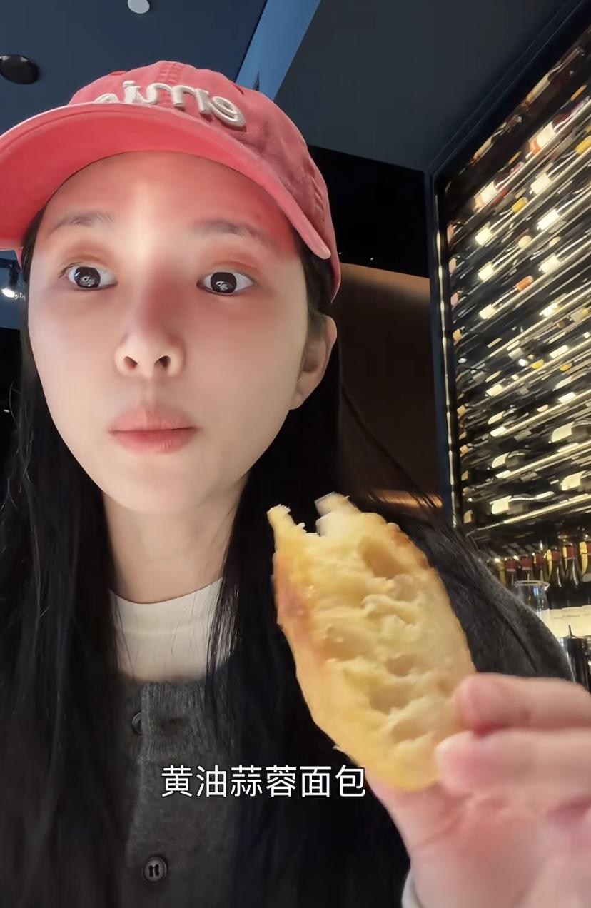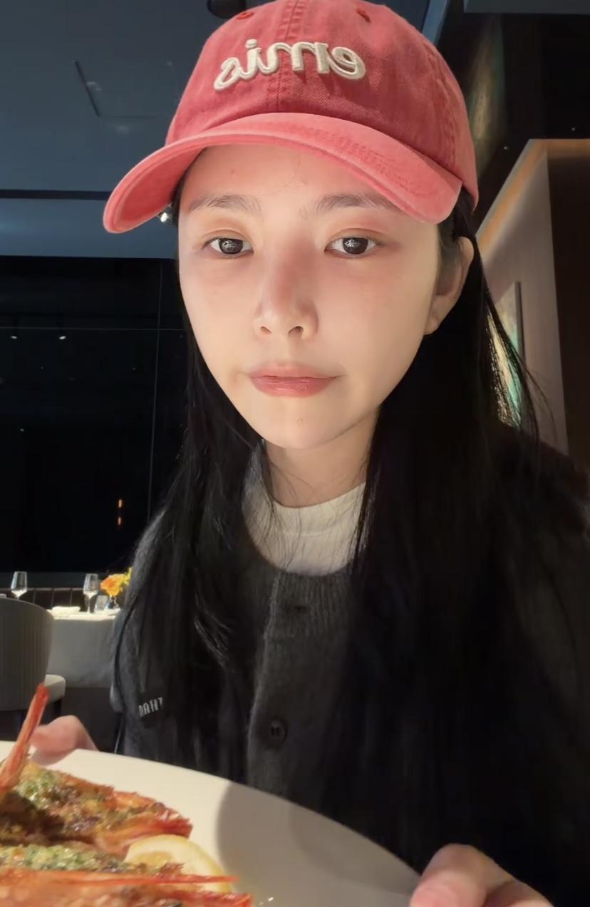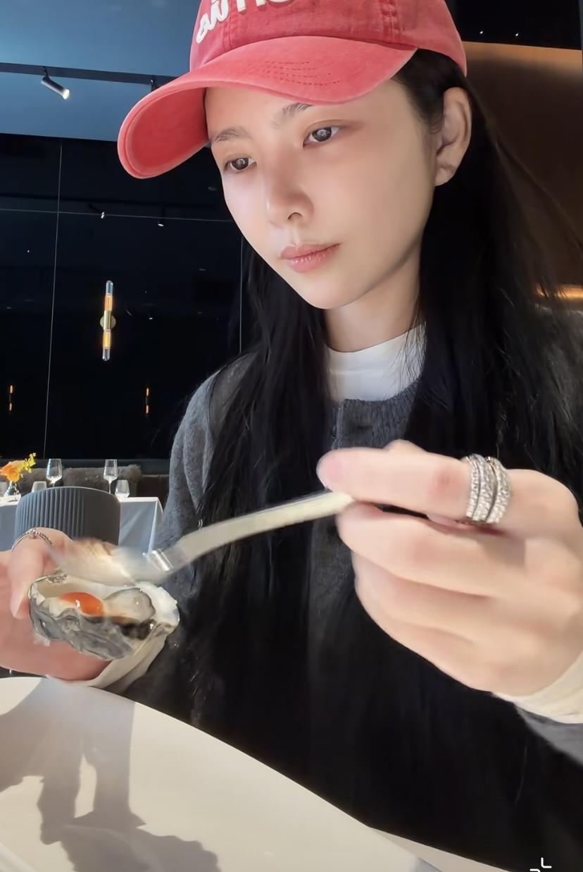 王燦的小臉很精緻,雙手也白皙細長。她的底妝清透、臉上一點瑕疵都沒有。品嚐生蠔的模樣很優雅,這是她心心念唸了許久的漂亮飯。