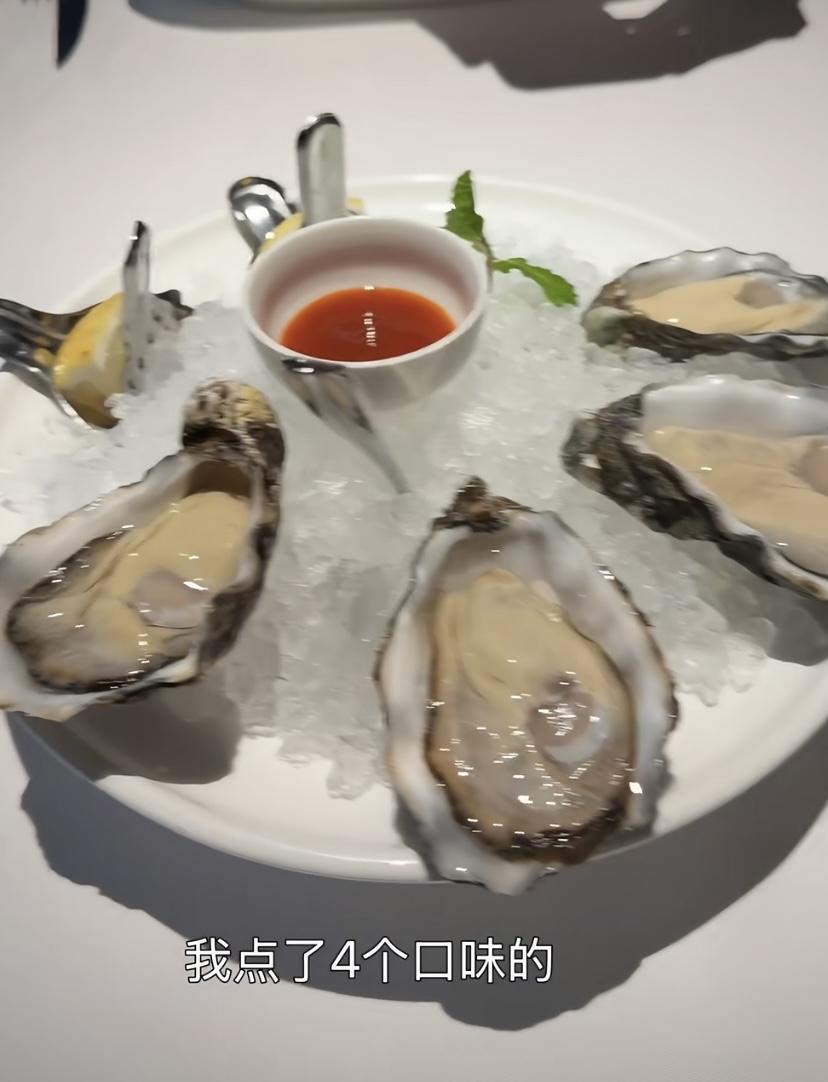 王燦一共點了4只生蠔,都是不同口味的。生蠔直接擺在冰堆上面,配了一小碗蘸料,保存了食材本身的鮮美。