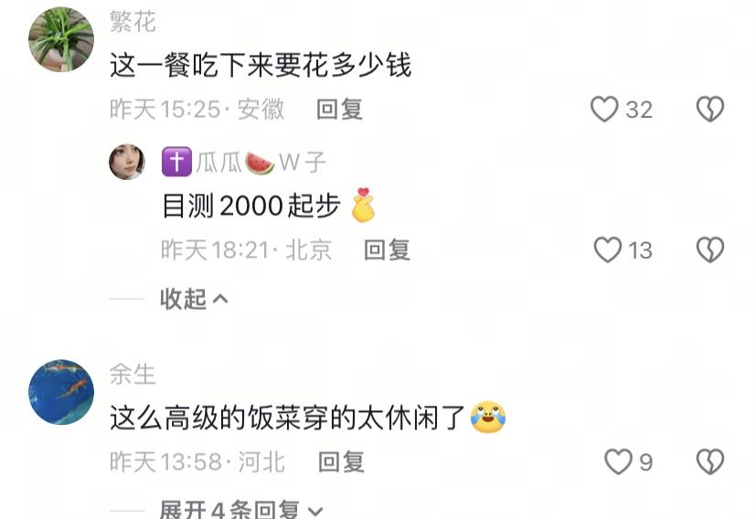 也有網友忍不住發問,這樣一餐喫下來要花多少錢。熱心網友回應,目測2000+起步,大概是人均2000+的樣子。