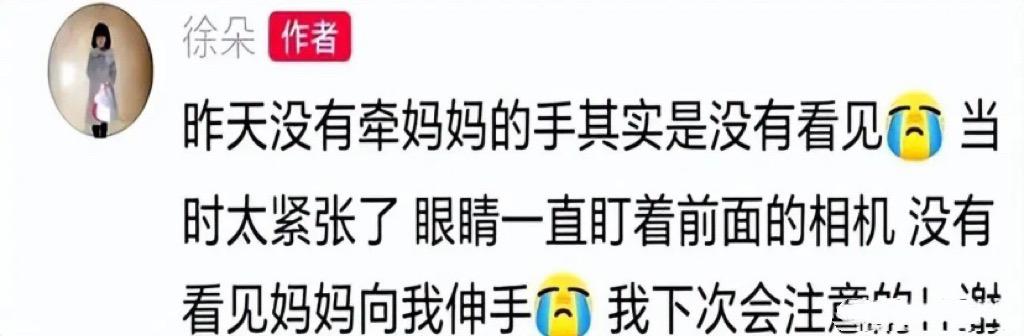 就在徐帆帶徐朵出席活動伸手被無視後,徐朵在社交平臺發文澄清了。表示沒有牽媽媽的手,其實是沒有看見,當時太緊張了,眼睛一直盯着前面的相機。
