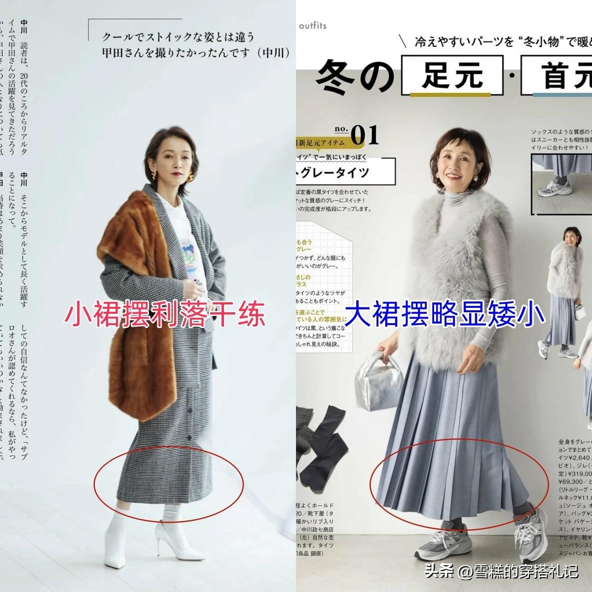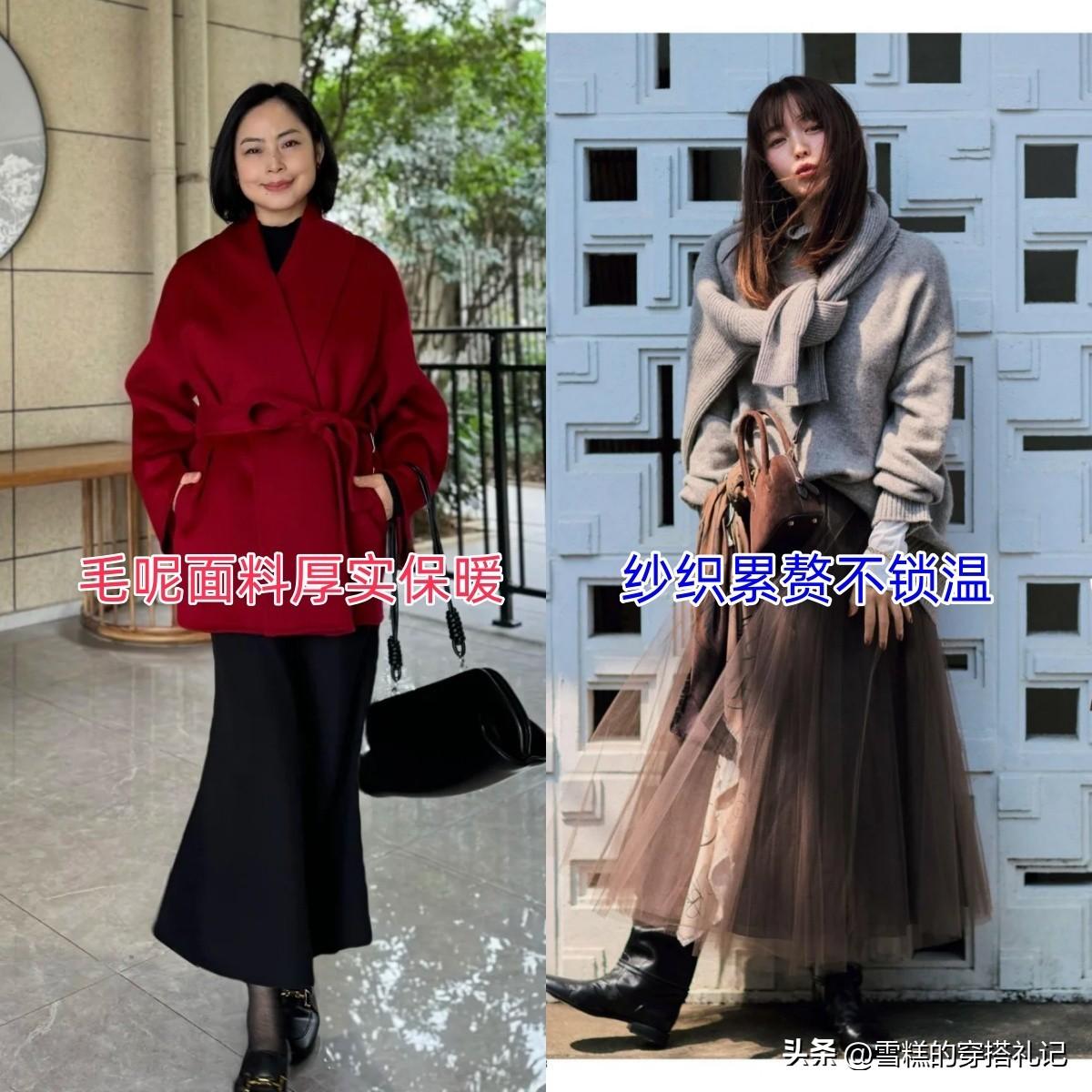 ——第三個穿搭的要點是面料的選擇。合適的厚度纔能有效提升造型的質感。像一般的雪紡系列材質偏薄,在秋冬沒什麼保暖效果,冬季腿部乾燥的情況下還容易貼腿產生靜電,因此不建議挑選。