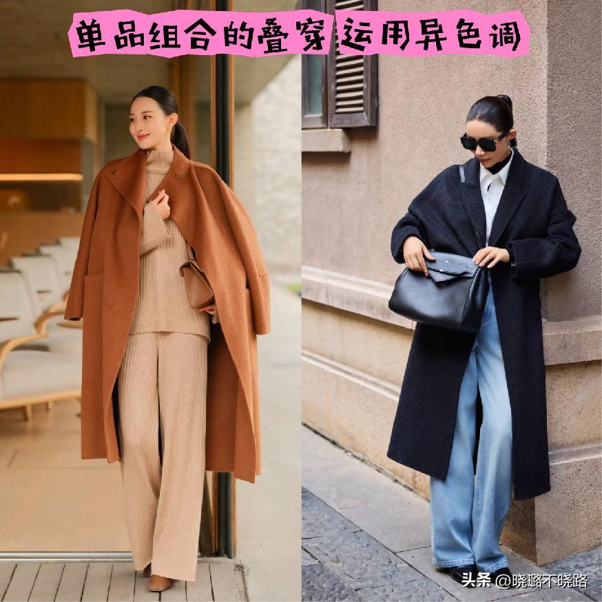 疊穿的搭配其實不太推薦大家選擇同色系,尤其是在冬季當中的時候,能夠在視覺上分割出來的輪廓感走向是不太明顯的。所以各位就可以優選運用不一樣的顏色,例如像長款的大衣是屬於暗色,那麼我們所選擇的內搭就是淺彩色或者是白色系。