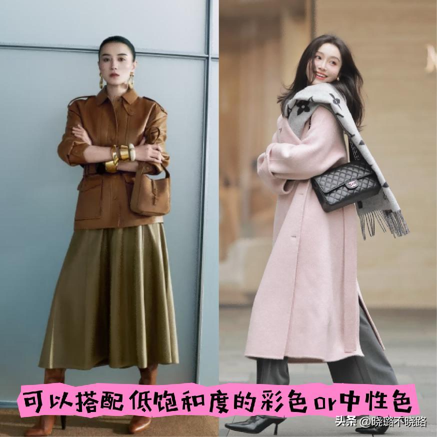 但是對於不少年輕的女性來說,在搭配長款大衣的時候往往都會選擇一些彩色調,也一定要記住,不要選擇比較亮或者是不穩定的彩色,優先於運用飽和度和明度都比較低的類型,例如像香芋紫,又或者是藕粉色還有就是霧霾藍這一類,都是很有有氣質的穿搭。第2種的話則是比較常規的中性色,例如像皮衣大家就可以選擇深棕色。