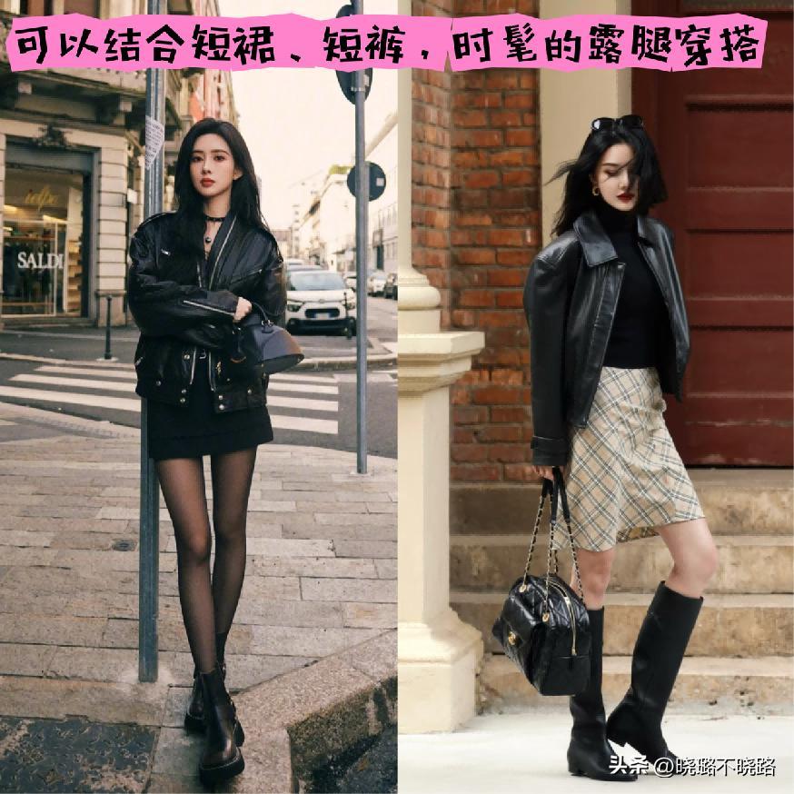 當然啦,有不少很時髦的女生,她們在選擇皮衣和大衣進行搭配的時候,就說選擇露出來腿部的狀態,真的是非常的能夠彰顯女性的魅力以及時髦感。結合的單品如果是屬於短裙、短褲這樣的類型,那麼這個時候就可以結合搭配長筒靴,拉長我們的縱向腿型比例。