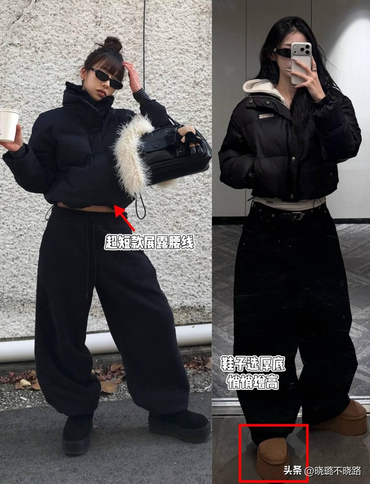 •推薦搭配:超短款羽絨服+黑色高腰闊腿褲+雪地靴