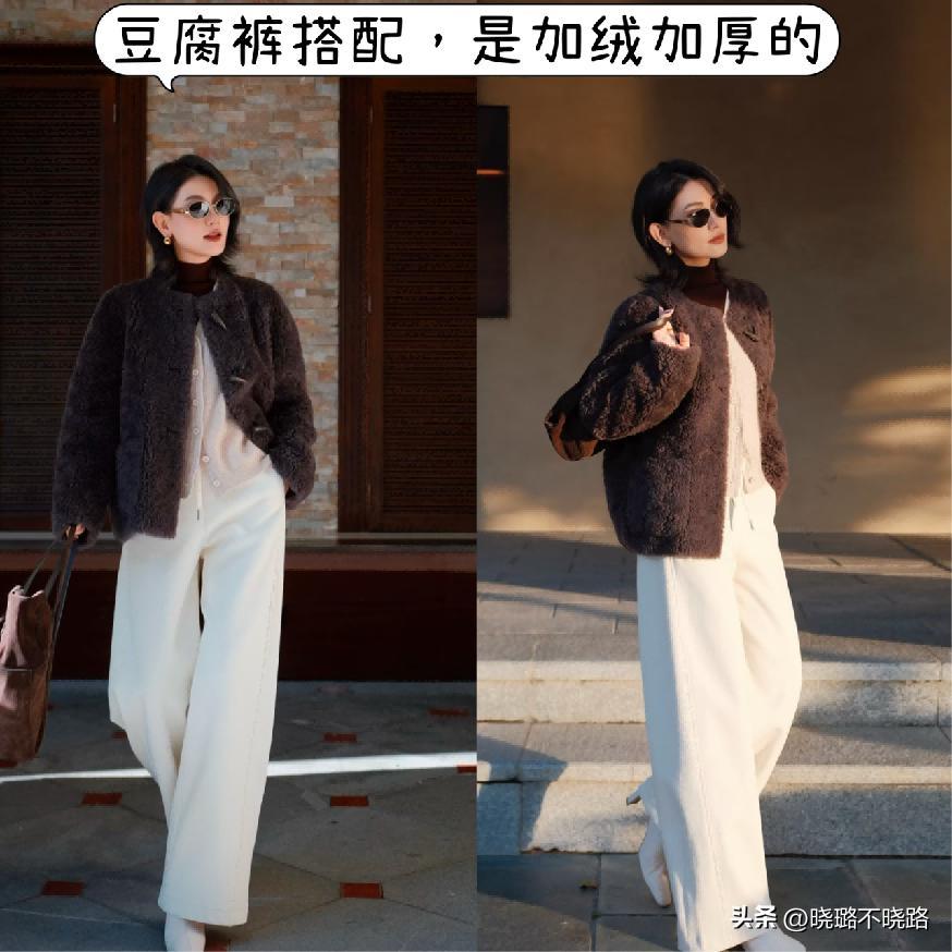 所以每次到了冬季當中的時候,建議大家在選擇單品的話,首先還是要保證能夠展現出來一定的視覺美感和對於我們身形有修飾效果,以及又能夠保暖。所以在今天的分享當中,就推薦給大家可以首選運用加棉加絨的豆腐褲,搭配起來的時候,不僅能夠優化腿型的狀,態而且會比其他的下半身單品更顯溫柔。