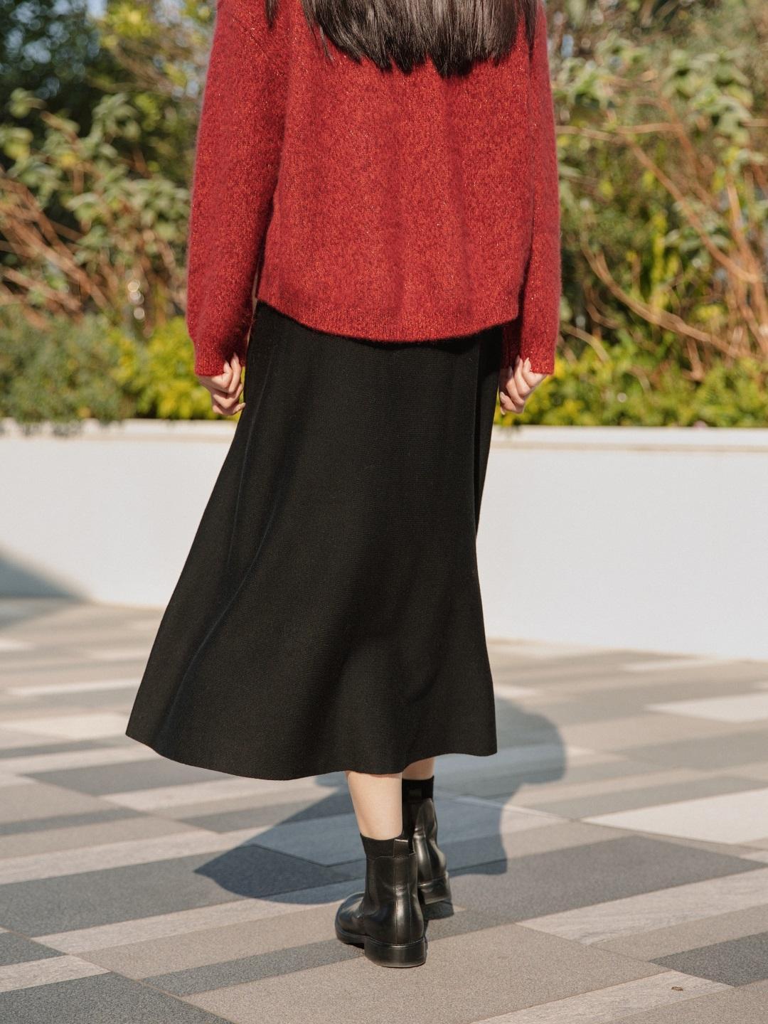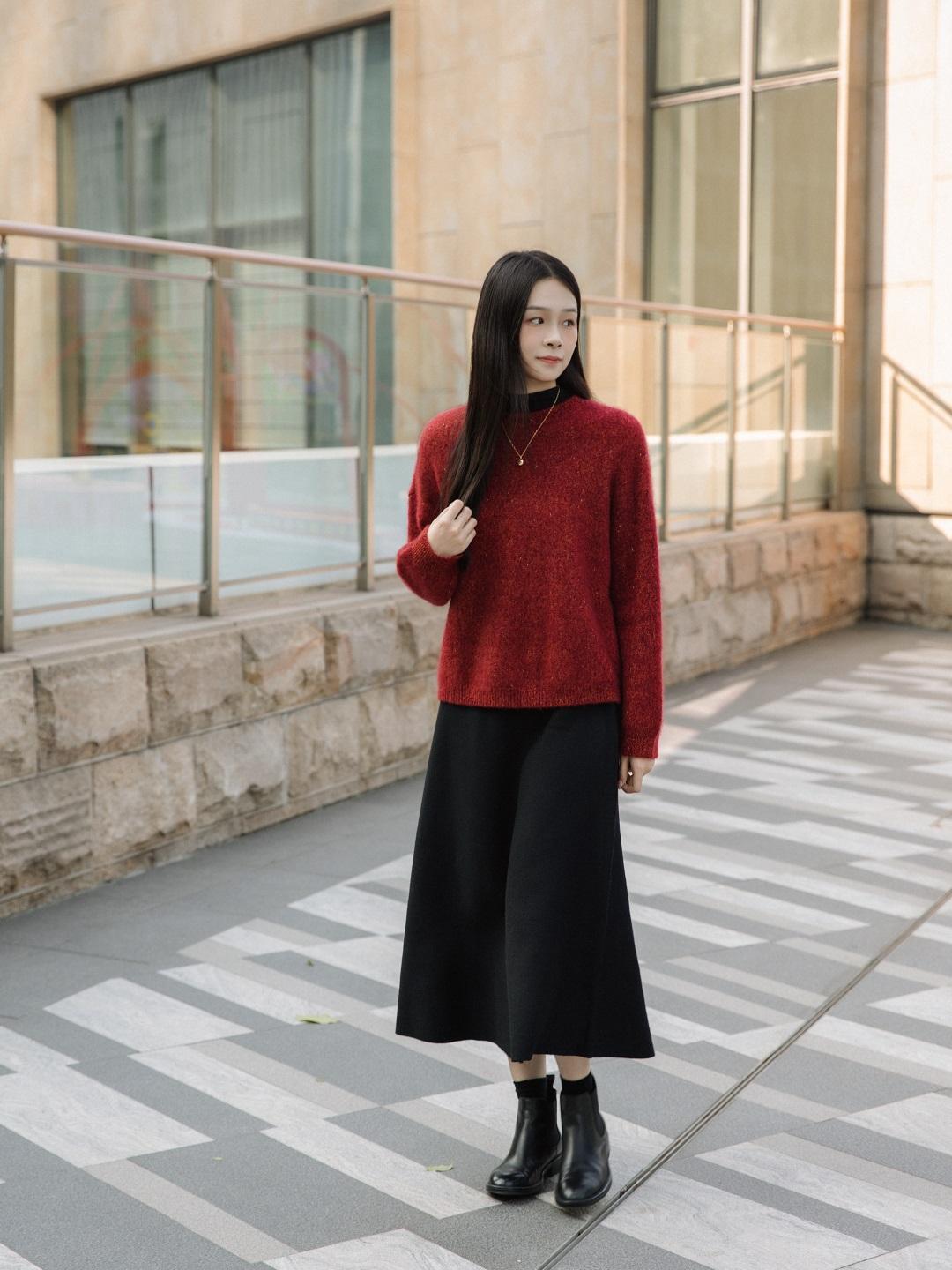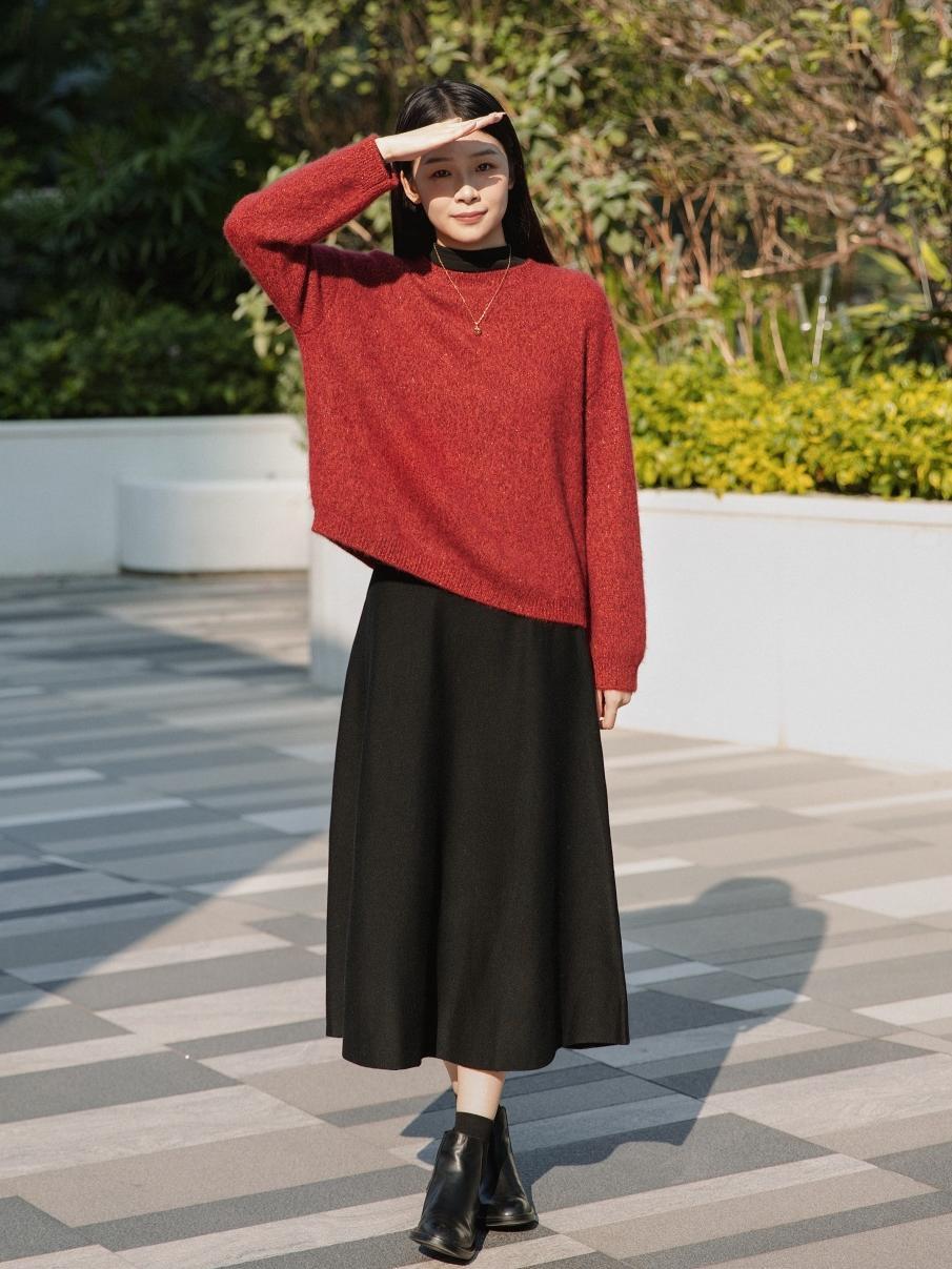 年底都想給搭配里加點紅,這時候也離不開黑色半裙的襯托。這套Look真的很適合接下來新年穿~▼