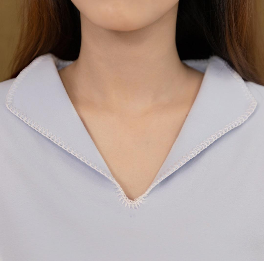 領口是V字翻領+精緻的一字繡設計,穿脫也方便。▼