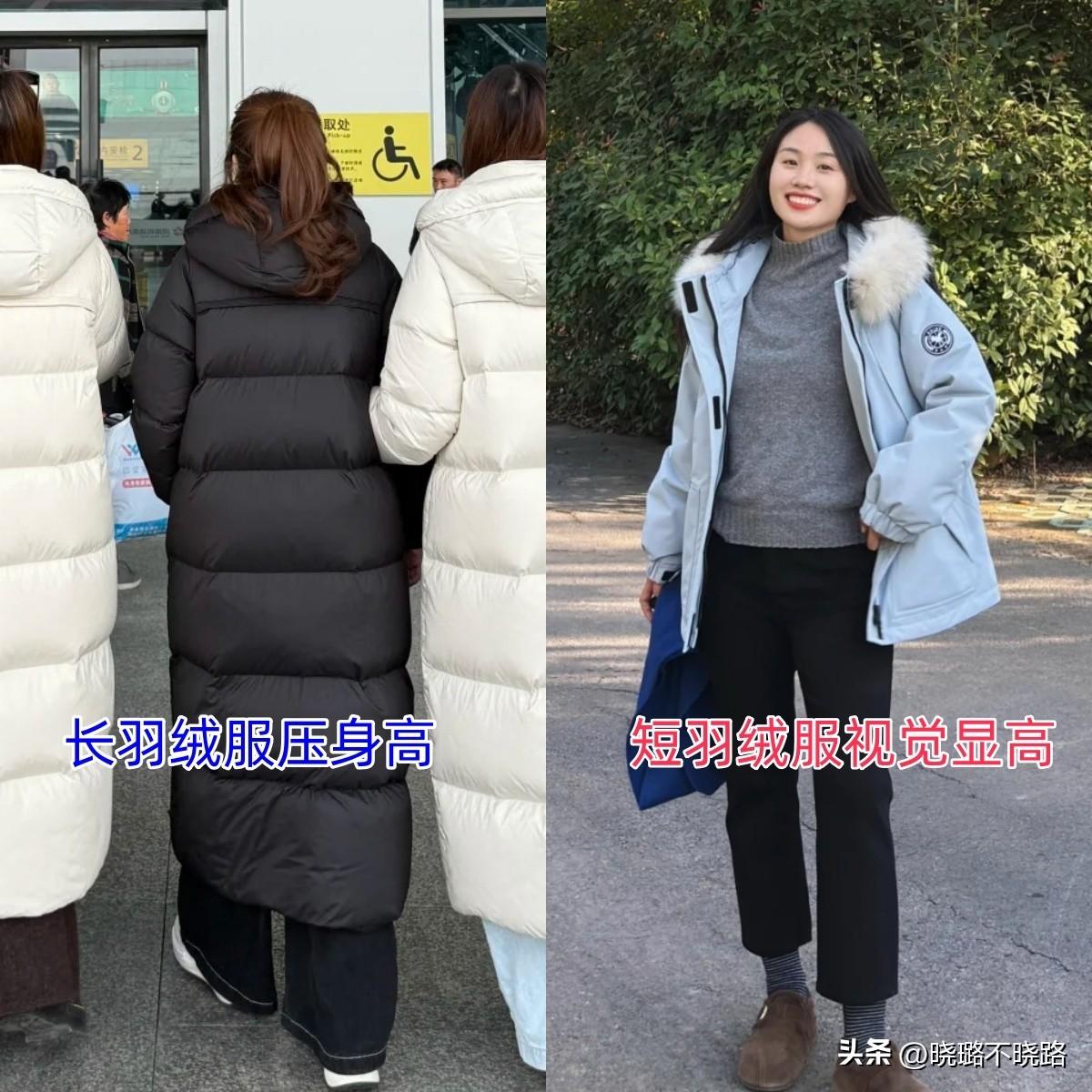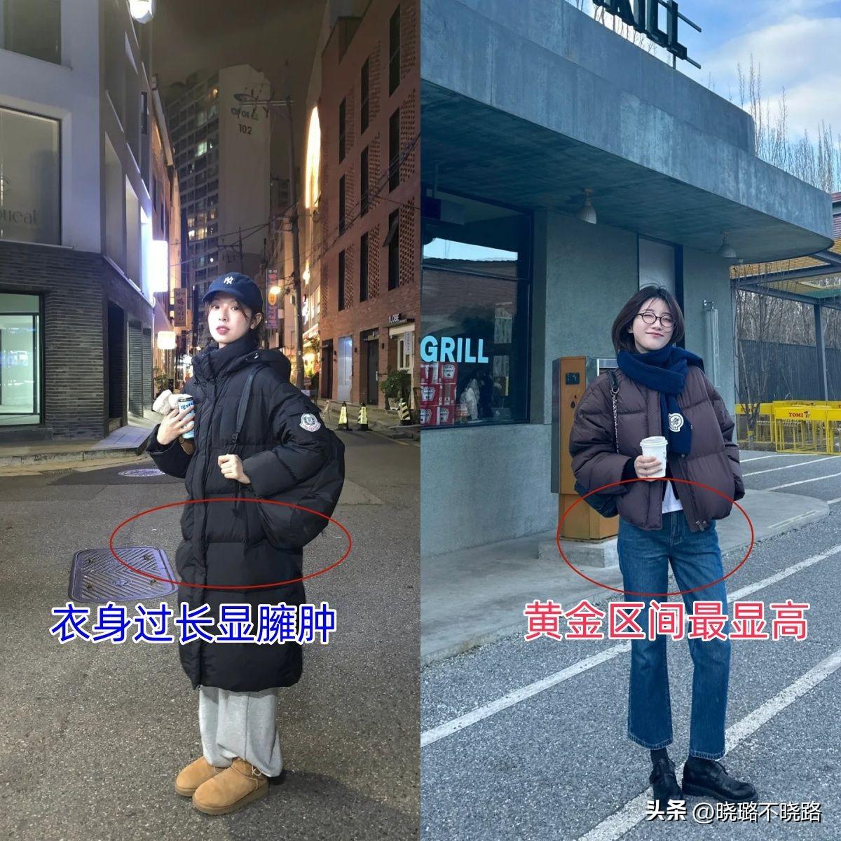 >>>>短羽絨的“黃金區間”,是長度維持在約55–62cm的區間,基本上就是腰線以下,胯骨往上一點。在這個長度的羽絨服加持下,能還很好兜住冬季的冷風和低溫,讓腰腹不至於受涼,且針對小個子不會壓低身高,不會有顯矮的風險,搭配高腰的褲裝簡直就是“隱形顯高”的最佳組合。