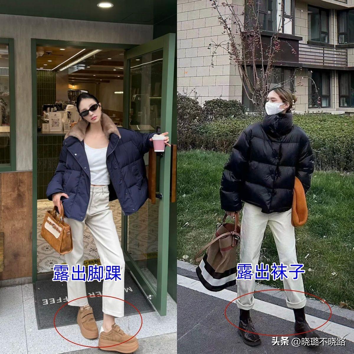 ④視覺顯高,不再“硬撐”:短款的羽絨衣襬基本都剛好落在腰臀的分界線,這個時候讓煙管褲直接從胯部開始向下垂落,褲腳在腳踝位置收至。就能很好形成一個“腰線高”、“腿型長”的效果。在此基礎上隨便搭配一雙平底鞋都能有視覺顯高的氛圍,小個子們再不用咬着牙穿各種高跟鞋或厚底鞋了。