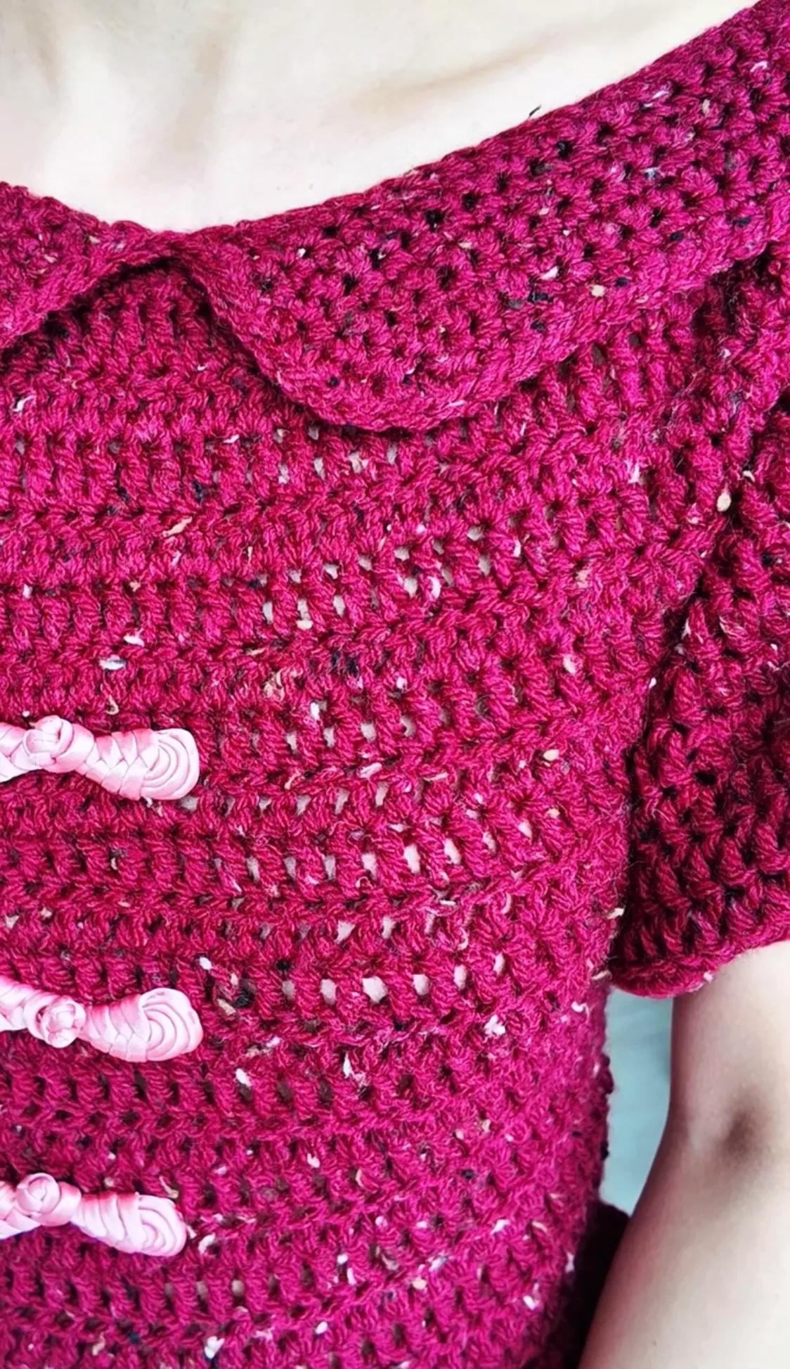 紅色鉤線還增加了粉色裝飾,遠遠地看、就像是帶着細閃效果一樣。只能說甘比太有心思的,把鉤織連體褲做得比高定款還好看。