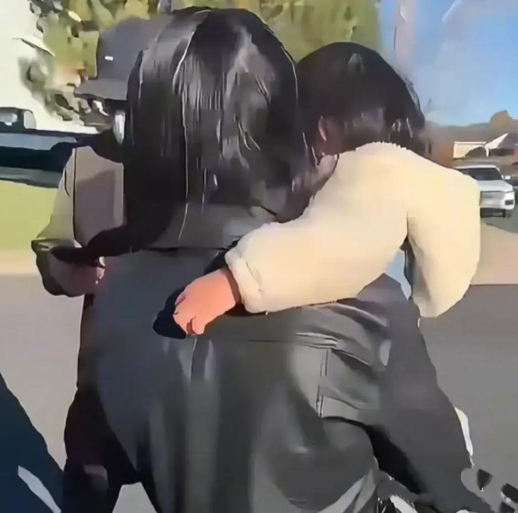 鄭爽抱着一個小女孩,她穿了一件黑色皮衣外套、內搭是條紋毛衣裙,配了一條瘦腿褲、黑色板鞋,打扮得有些隨意,完全沒有以前清純明媚的模樣了。