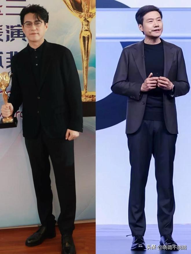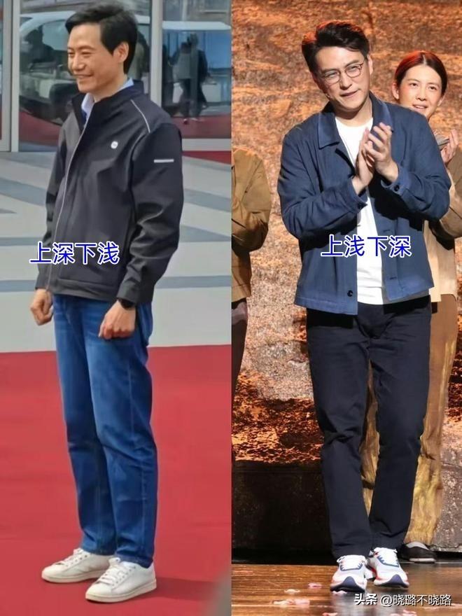 接着就是在搭配的時候需要製造出上下半身的亮度對比,雷軍和靳東日常都會採用兩種左右的顏色進行組合,刻畫出視覺落差感。