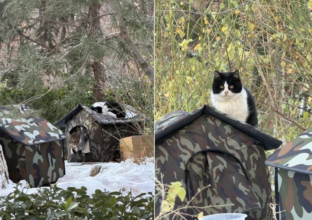 遛狗看到一隻新來的小奶牛睡在屋頂上。❄️北方的冬天怕ta太冷,火速下單一個超大號貓屋。拼裝完給放到貓貓聚居區了,很快就有小貓入住。再後來遛狗也看到小奶牛從裏邊跑出來,說明ta也住裏面,很開心。▼